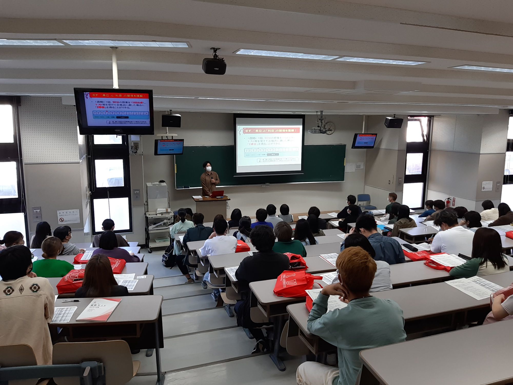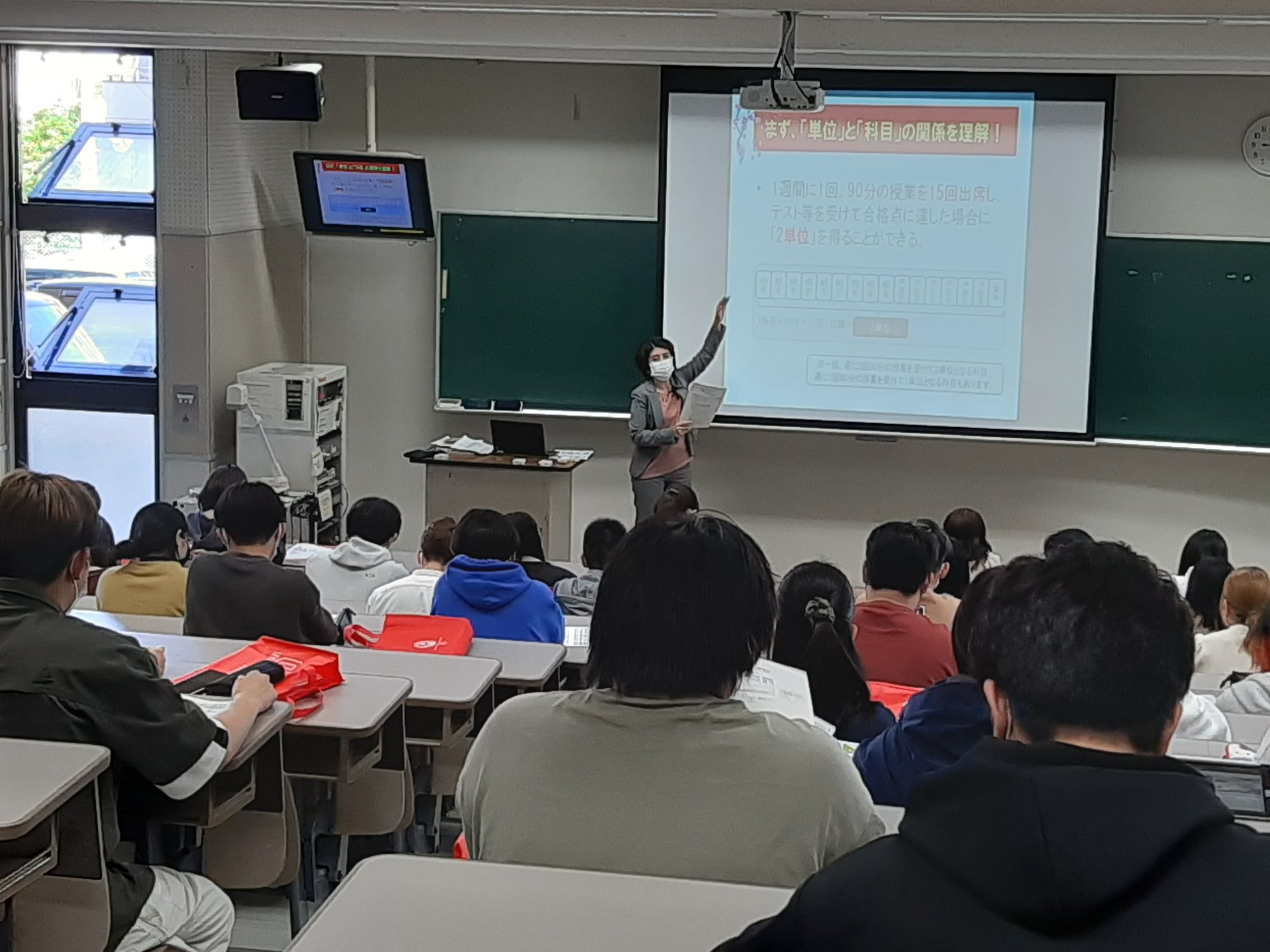 高校と大学の大きな違いは、自分で自由に時間割を作ることができる、ということです。でも、完全に自由というわけではなく、必修科目や選択科目、さらに資格科目など、決められた枠組みの中で科目を選択する必要がありますので、そのルールを朝から約2時間かけてしっかりと学びました。