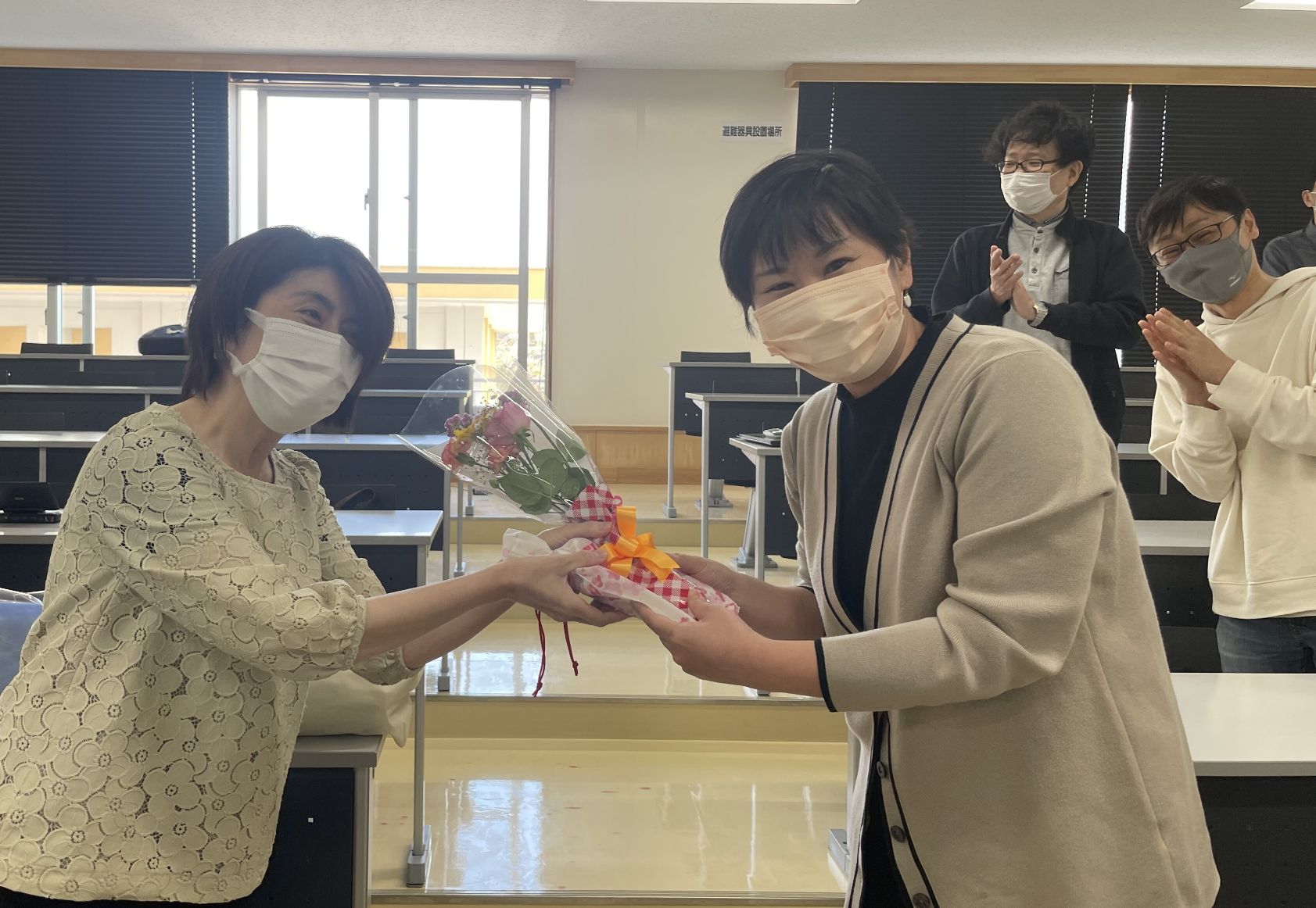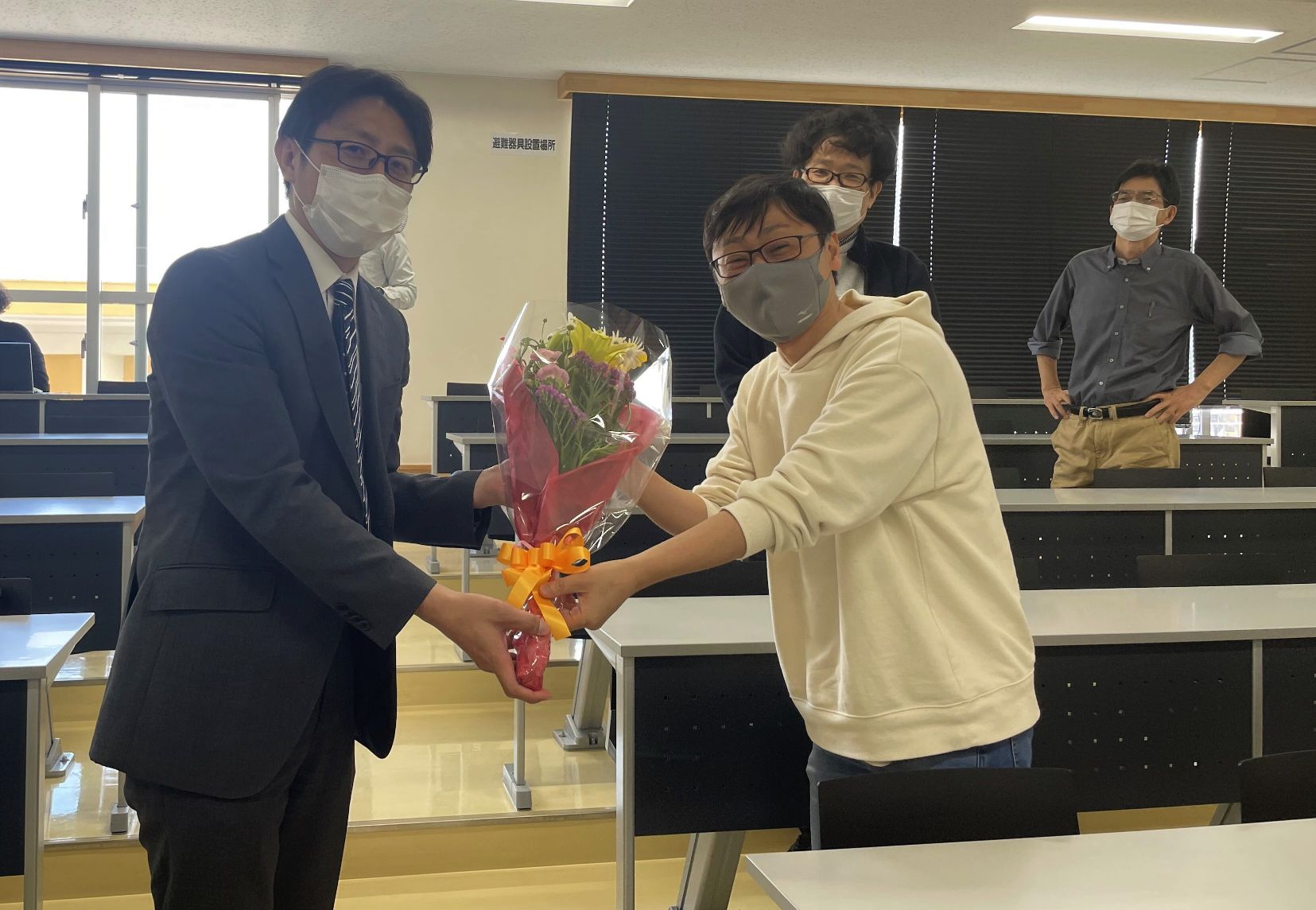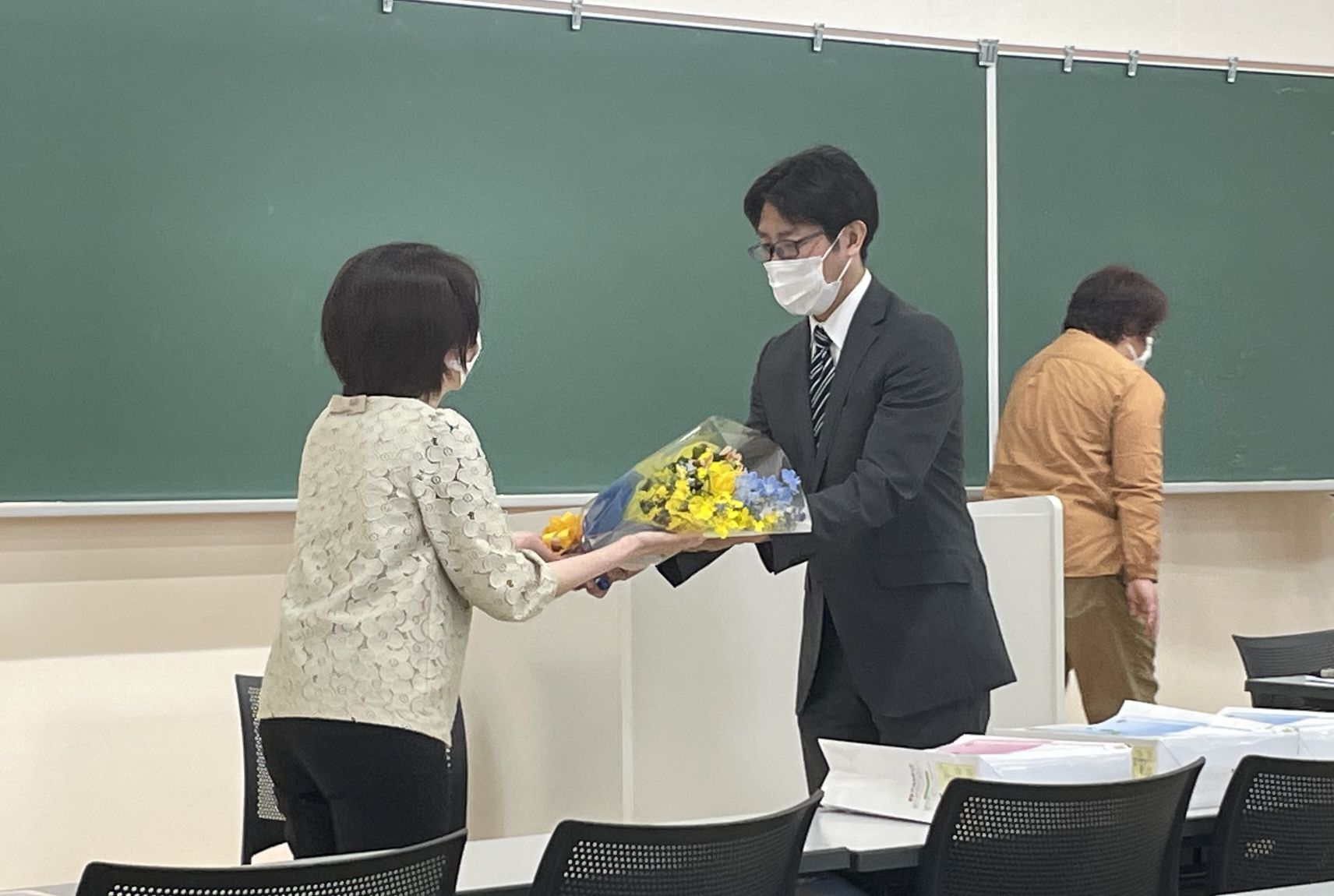 この日は、今年度1回目の教授会・学科会議ということで、4月から新しく着任された名城邦孝先生と、教授に昇進された村上陽子先生へ、ささやかですが学科からお祝いの気持ちをお伝えする会を開きました。