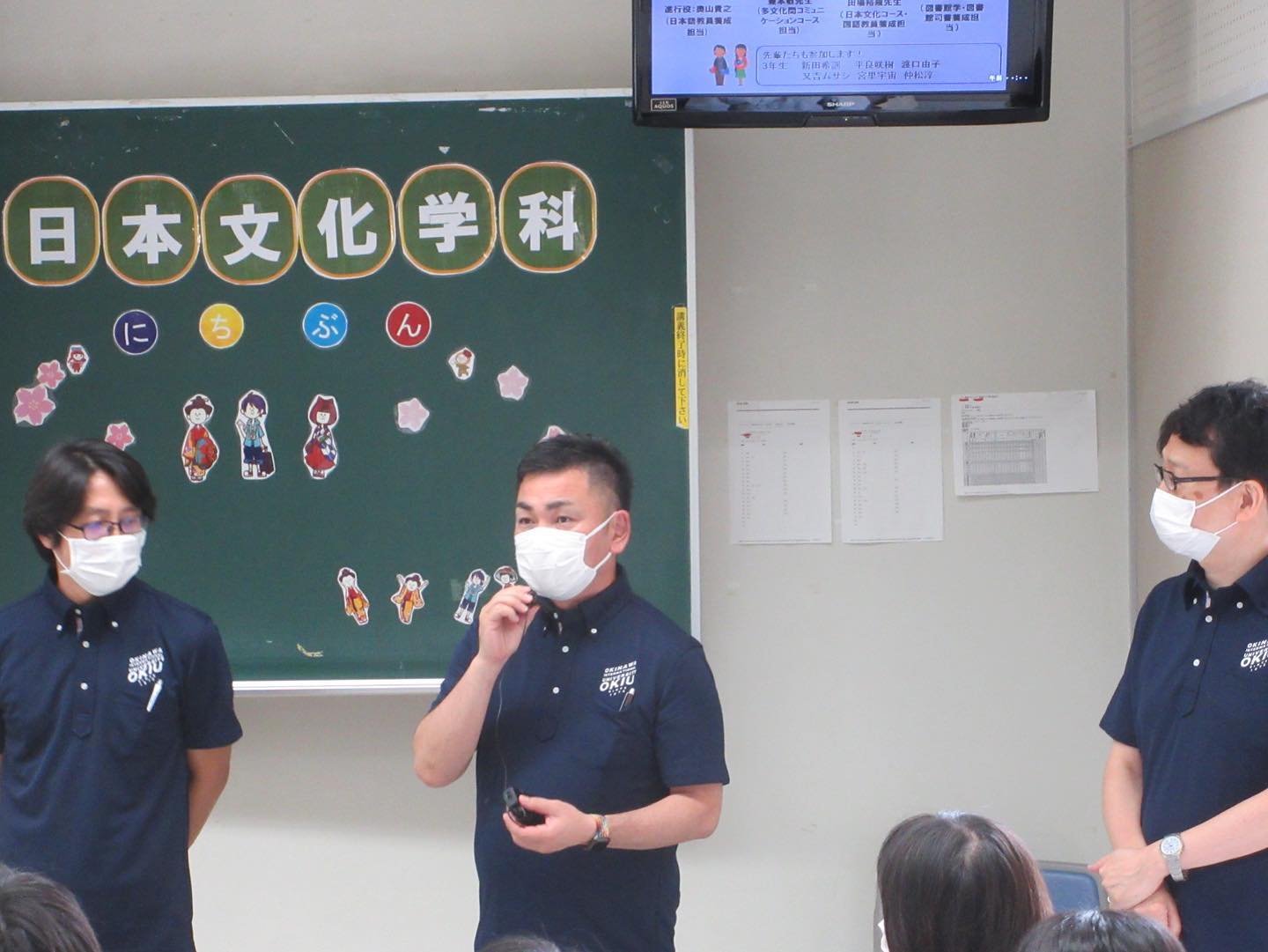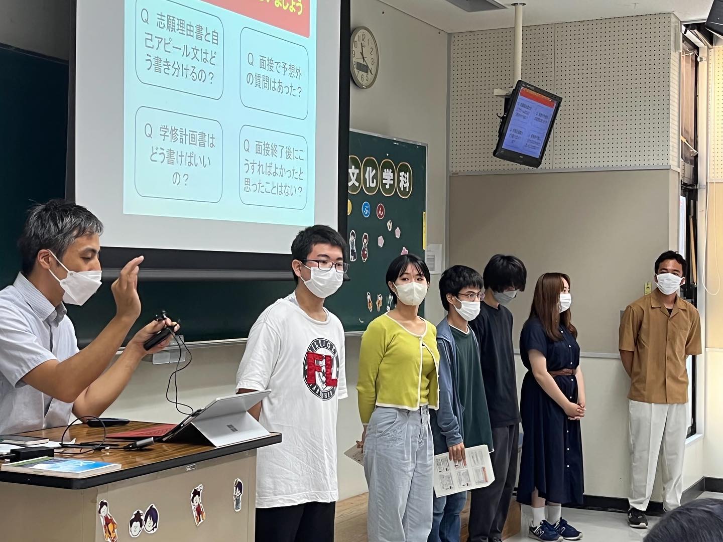 今回のオープンキャンパスは、完全予約制、3年生限定ということで、エントリーが間近に迫った総合型選抜試験対策を中心として、日本文化学科で日本語教師の資格課程や留学生教育を担当している奥山貴之先生から、日文のカリキュラムの魅力を伝えつつ、入試に向けたアドバイスをいろいろ行いました。