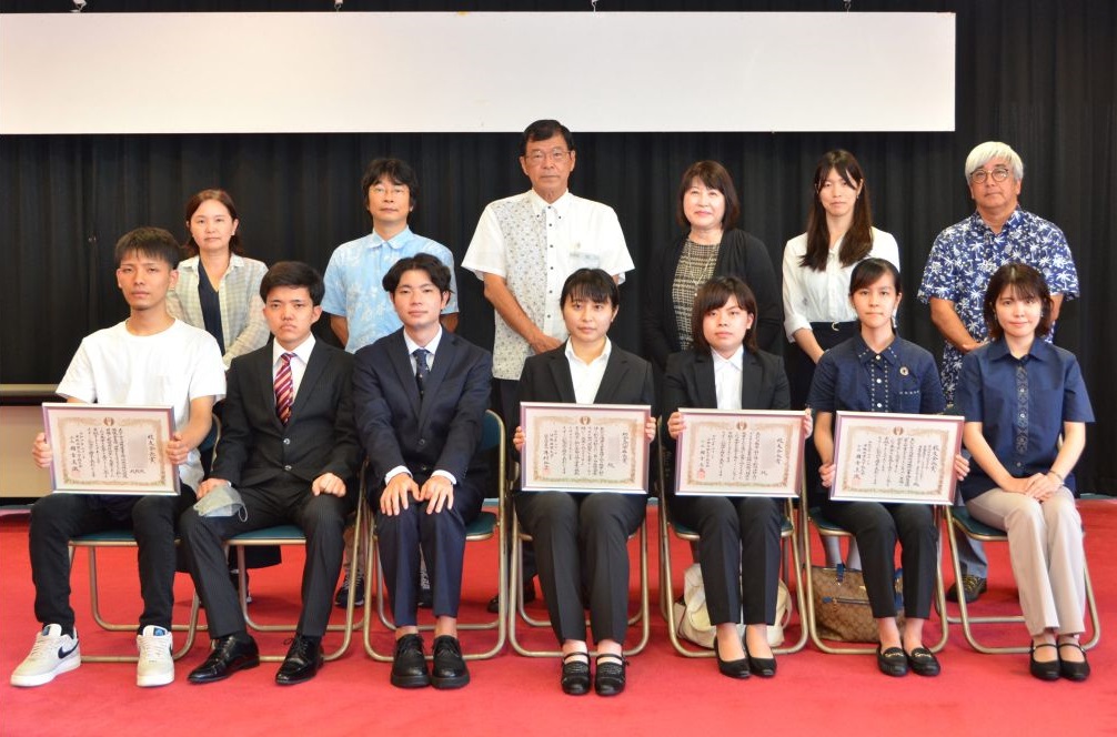 2022年7月22日、沖縄国際大学の厚生会館にて学生表彰授与式が執り行われ、今年度は、学部長賞が1名、校友会長賞が3組(8名)の合計9名の学生が表彰されました。