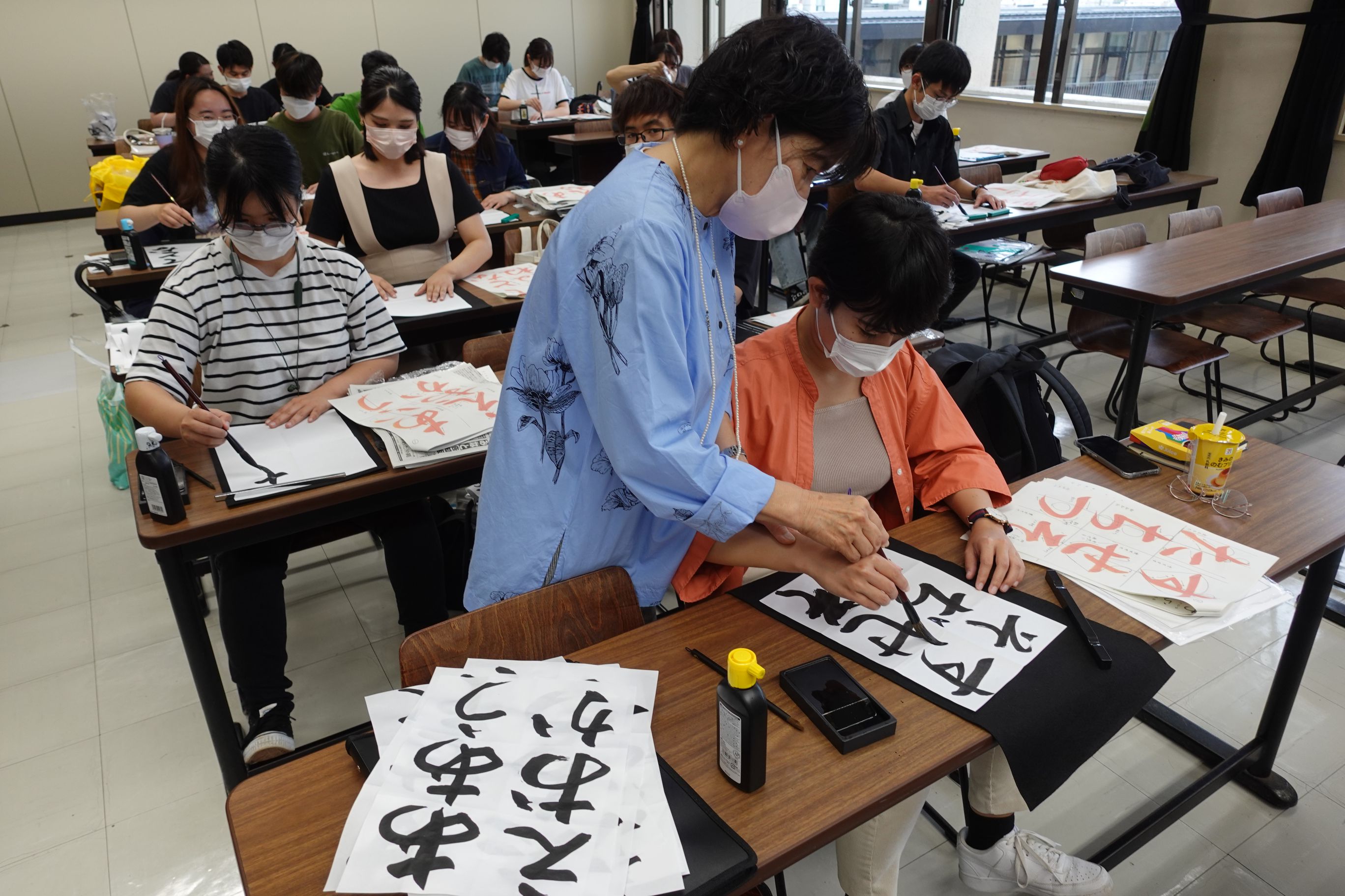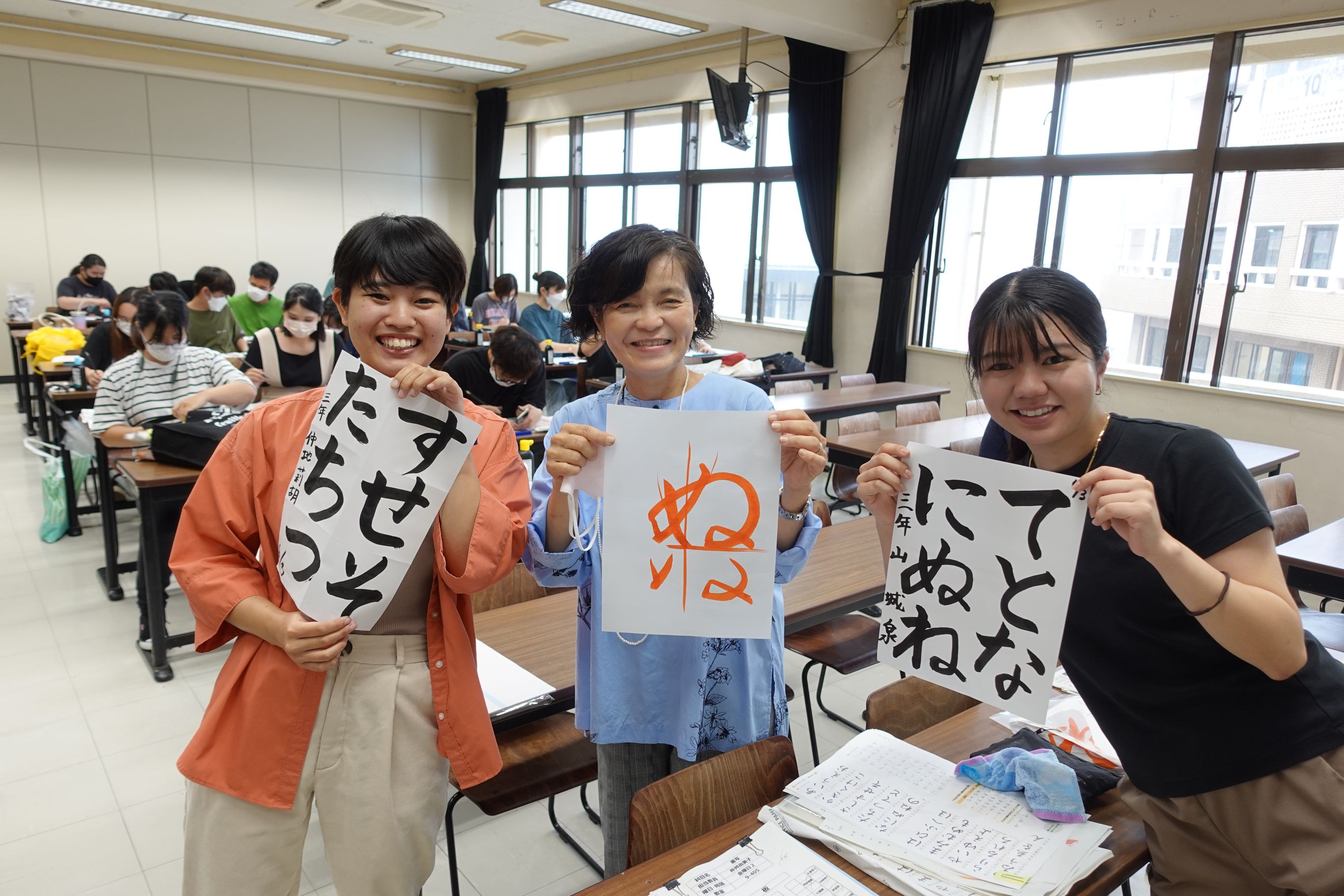 中学校や高校で実際に書道の授業を担当されていた先生を講師としてお招きして、高校までの授業とはまた違う、大学ならではの書道の授業が営まれています。