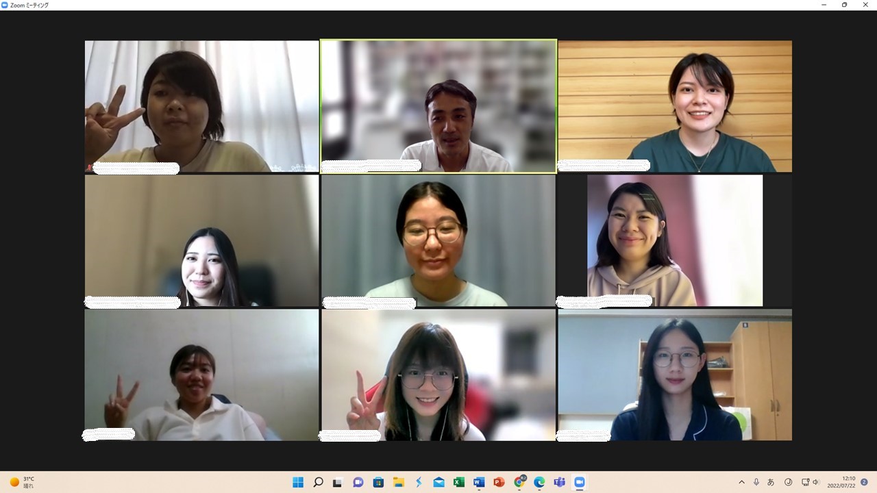 2022年度オンライン日本語学文化研修が7月18日から22日の5日間にわたって開催されました。この研修は、海外にいる日本語学習者の方に日本や沖縄の文化について知ってもらいながら、日本語を使ったコミュニケーションを楽しく行うことを目的としています。海外協定校からはマカオの学生1名と韓国の大学に在籍している中国出身の学生1名、沖縄国際大学からは日本語教員養成課程の「日本語教育実習Ⅱ」の受講生13名が参加しました。日本人学生は日を分けて、1日に4~5名が参加する形で、日本語学習者のお二人との交流を楽しみました。