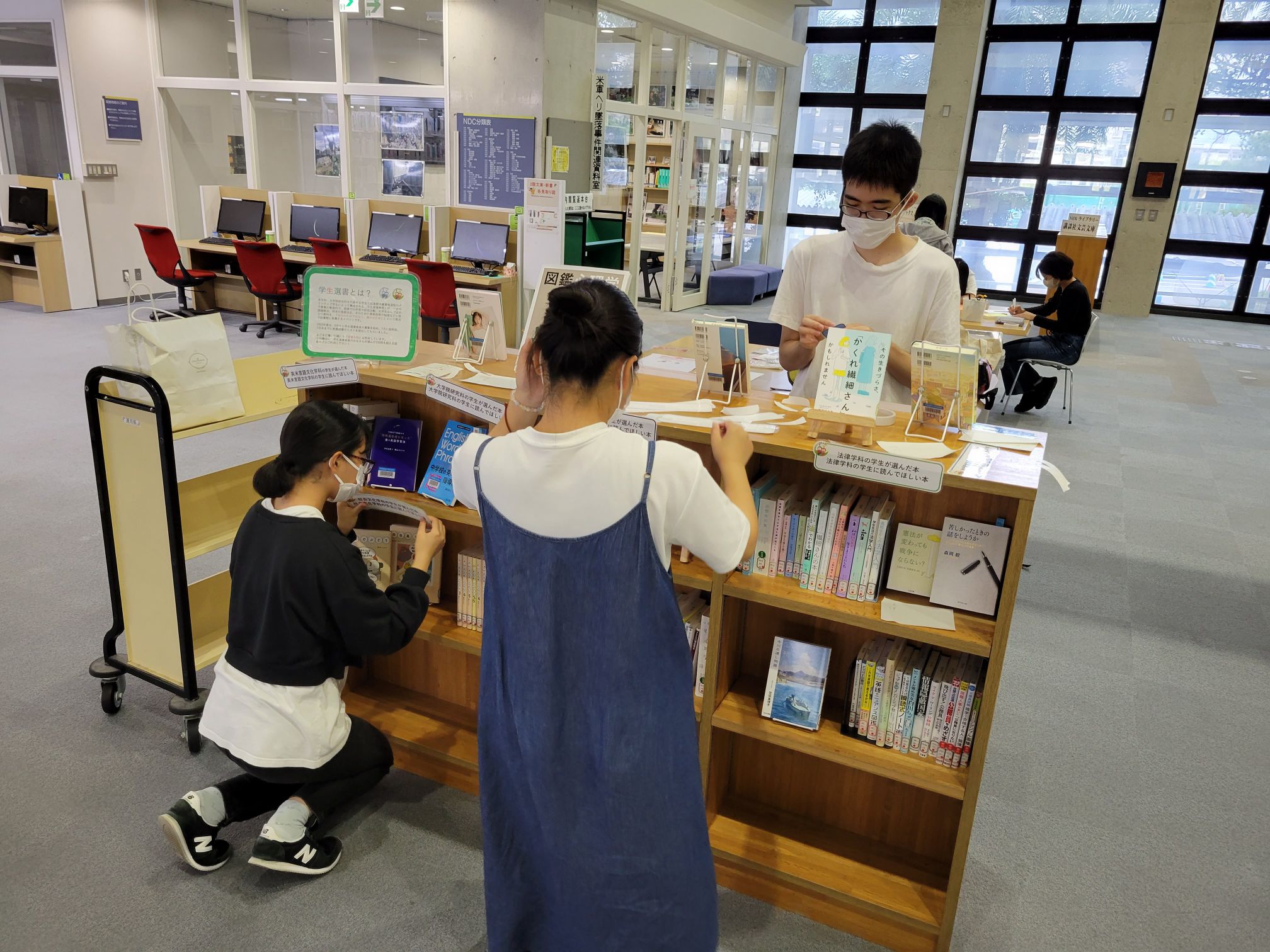 今回のイベントでは、「自分のために本を選ぶのではなく、同じ学科の学生のために、誰かのために本を選ぶ」というテーマで、図書館での選書に取り組んでもらいました。一番に借りたい気持ちをぐっと我慢して、おすすめ本のPOPを作成したり、効果的な展示レイアウトを考えたり、展示パネルをつくったり。作業はたくさんあって大変でしたが、自分が選んだ本が、装備を終えて手元に届いて、棚に並んだ様子を見ると、誰もが、本屋さんで同じ本を見るのとはまた違った感動を覚えた様子でした。