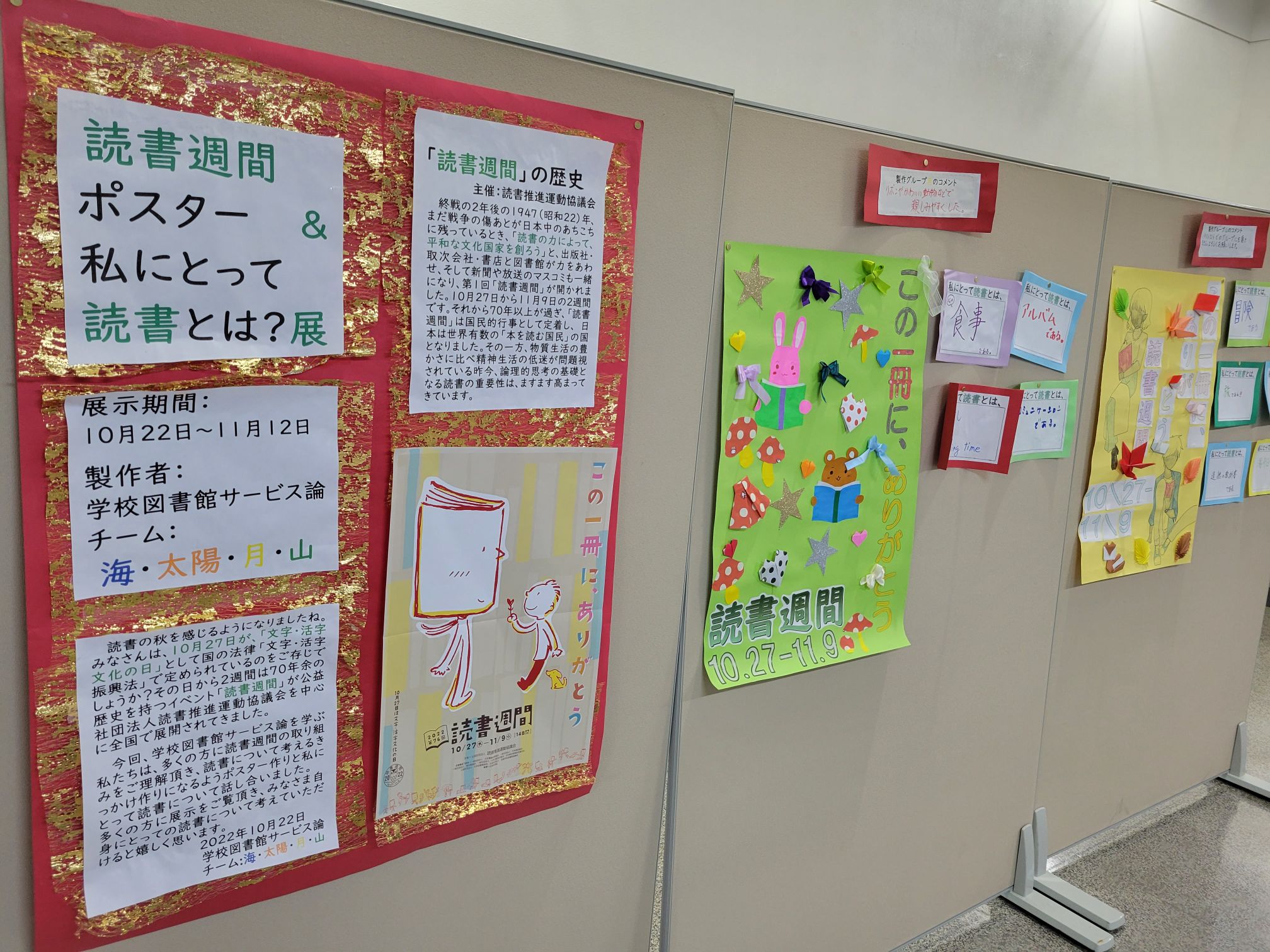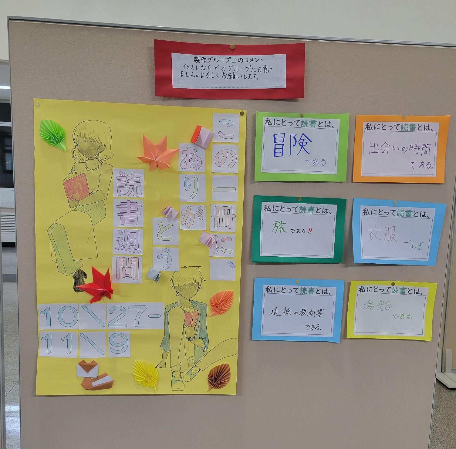 また、ポスター作成と並行して、授業時間内でのグループ討議「私にとっての読書」についてのコメントも一緒に展示しています。