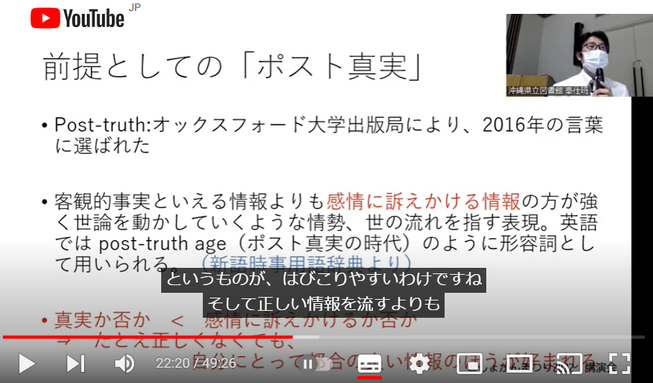 11月3日の文化の日に、沖縄県立図書館にて開催された「図書館まつり」のなかの講座の1つ、「正しい情報の見極め方」。