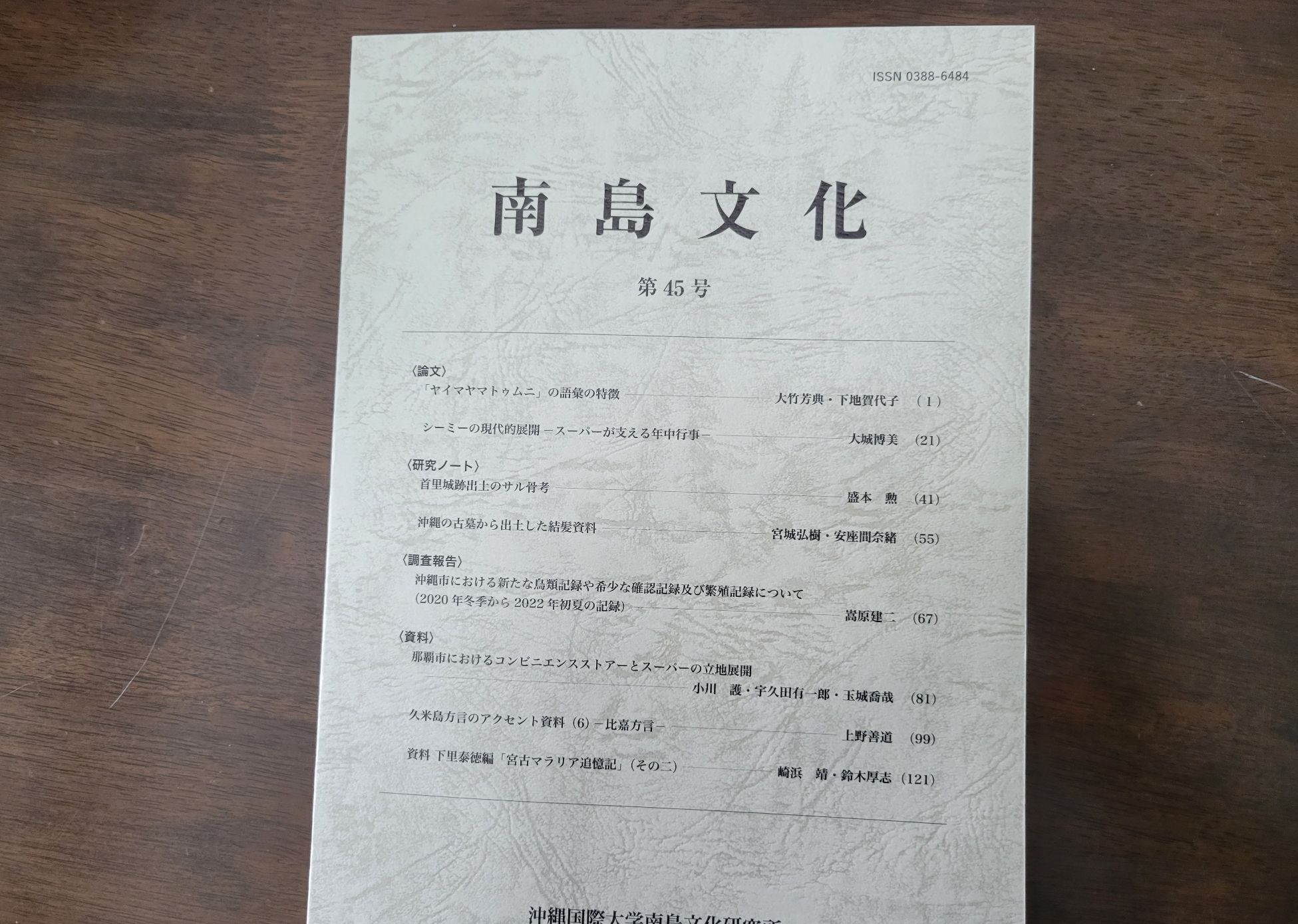 沖縄国際大学に設置されている南島文化研究所が毎年発行している専門誌『南島文化』の第45号に、日本文化学科で言語学の授業を担当されている下地賀代子先生と、2021年度卒業生である大竹芳典さんの論文が掲載されました。