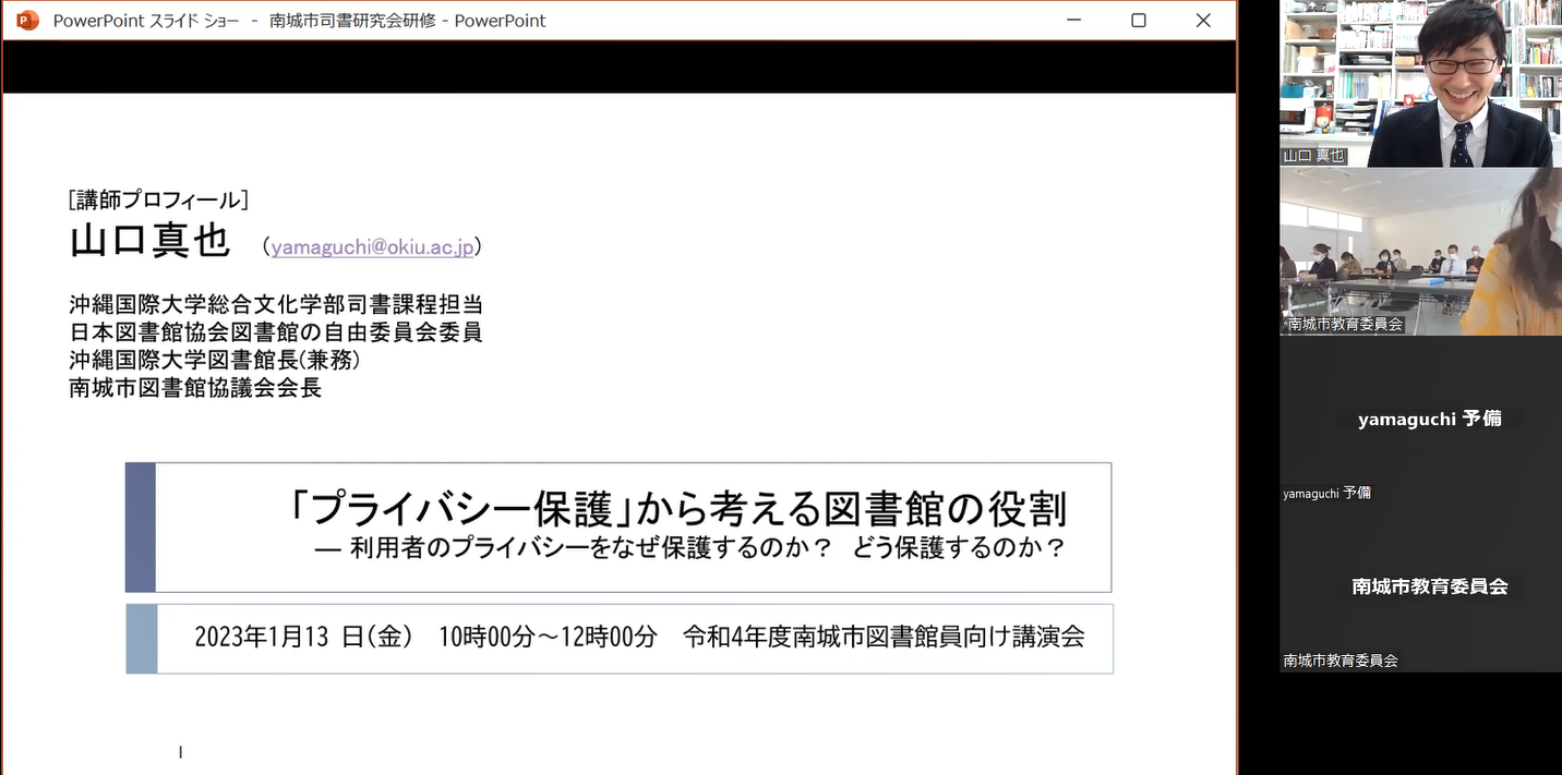 山口先生の体調の都合もあって、急遽、オンラインでの開催となりましたが、画面越しでしたが、質問もたくさん寄せていただき、山口先生自身も現場での具体的な問題を知ることができてとても勉強になったそうです。また、山口先生は2022年4月から、南城市の図書館協議会の会長を務めています。研修会では南城市の司書の皆様と交流もできて、とても有意義な時間になったとのことです。