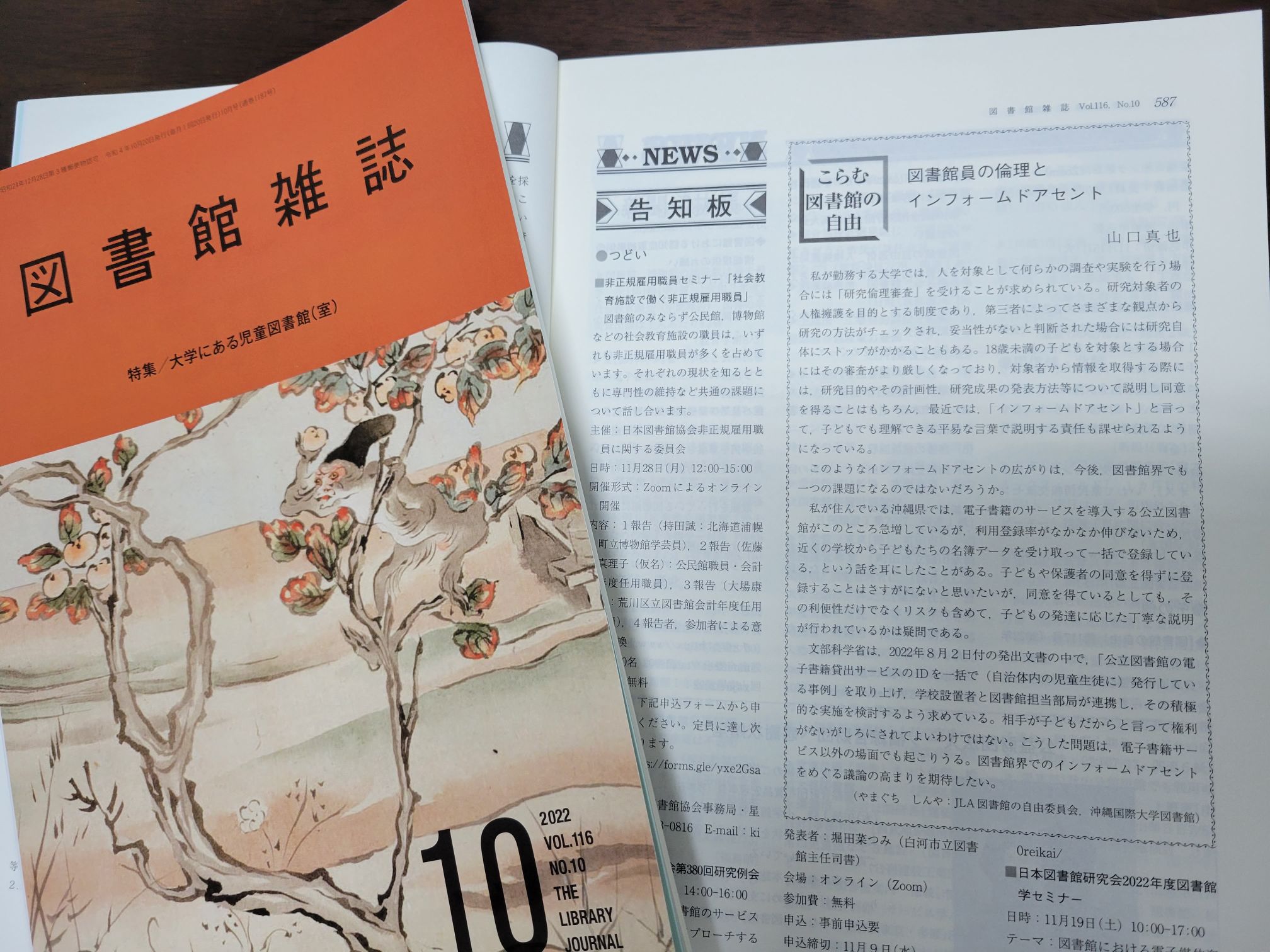 山口先生が委員の一人を務める、日本図書館協会図書館の自由委員会のメンバーが持ち回りで担当する連載コラム「こらむ図書館の自由」の一編として、『図書館雑誌』2022年10月号に掲載されています。