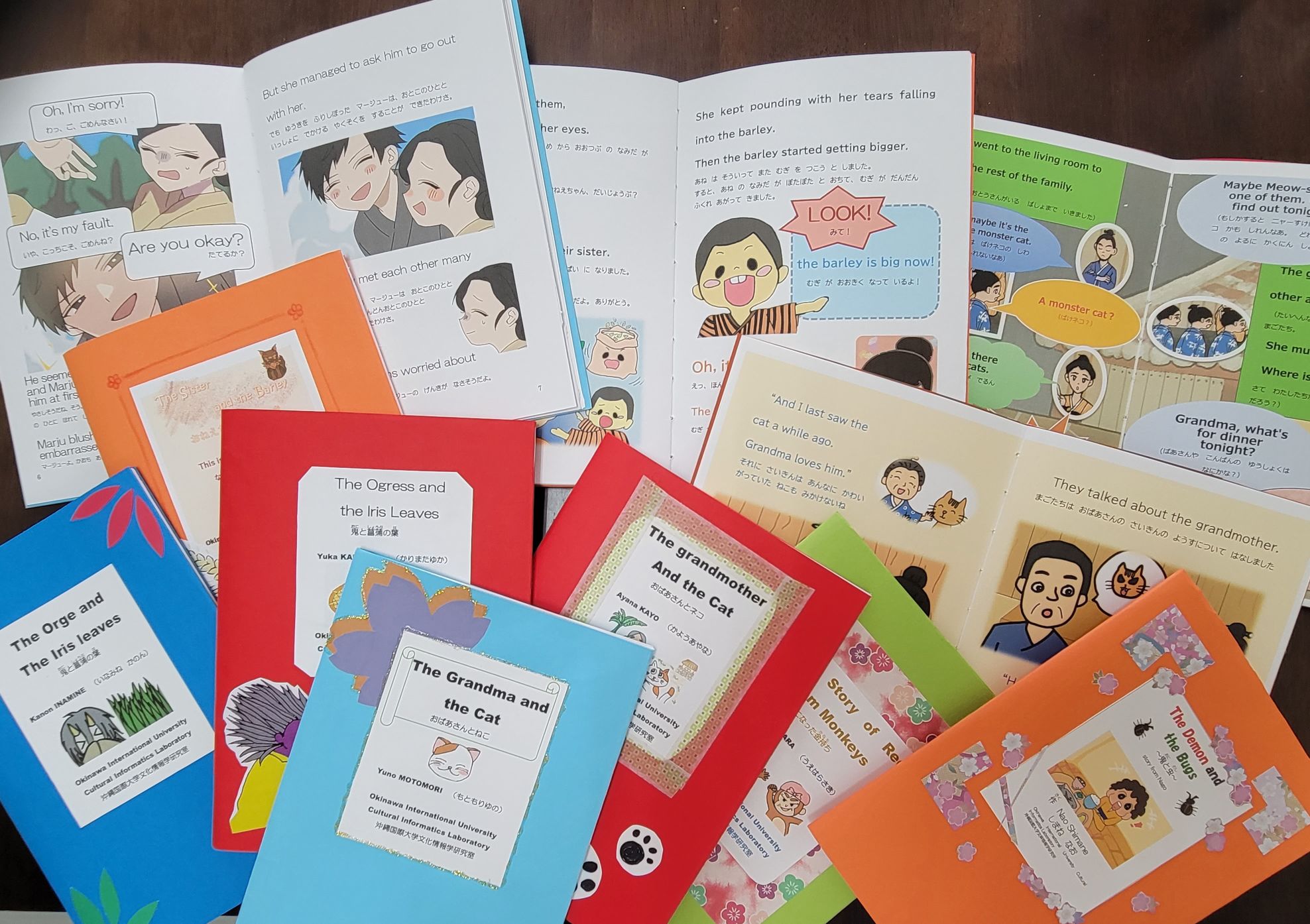 日本文化学科の多文化間コミュニケーションコースでは、沖縄に古くから伝わる文化を学び、次の世代へ継承し、さらに【世界に発信】していくためのモデル学習の1つとして、沖縄の民話(昔話)を【英語絵本】にして、地域の学校や公民館、図書館、地域の子育てNPOなどに届ける活動を長く行っています。
