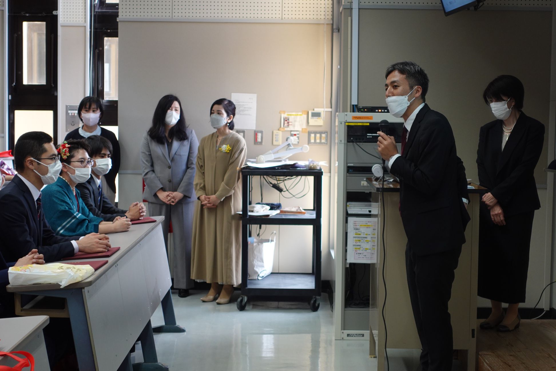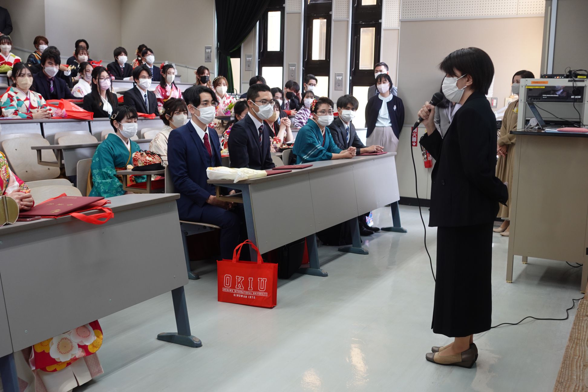 「この中には進路が決まっている人だけでなく、決まっていない人もいると思います。卒業後に学生と会うことがありますが、スタートが遅かった人も、日本文化学科で学んだことを生かして社会で活躍しています。コロナ禍は大学生活にいろいろな影響を及ぼしましたが、体調が悪いときは無理をしない、無理はしてはいけない、ということを学べたことはとても良かったと思います。焦らずに、自分を大事に、自分のペースで進んでいってください」