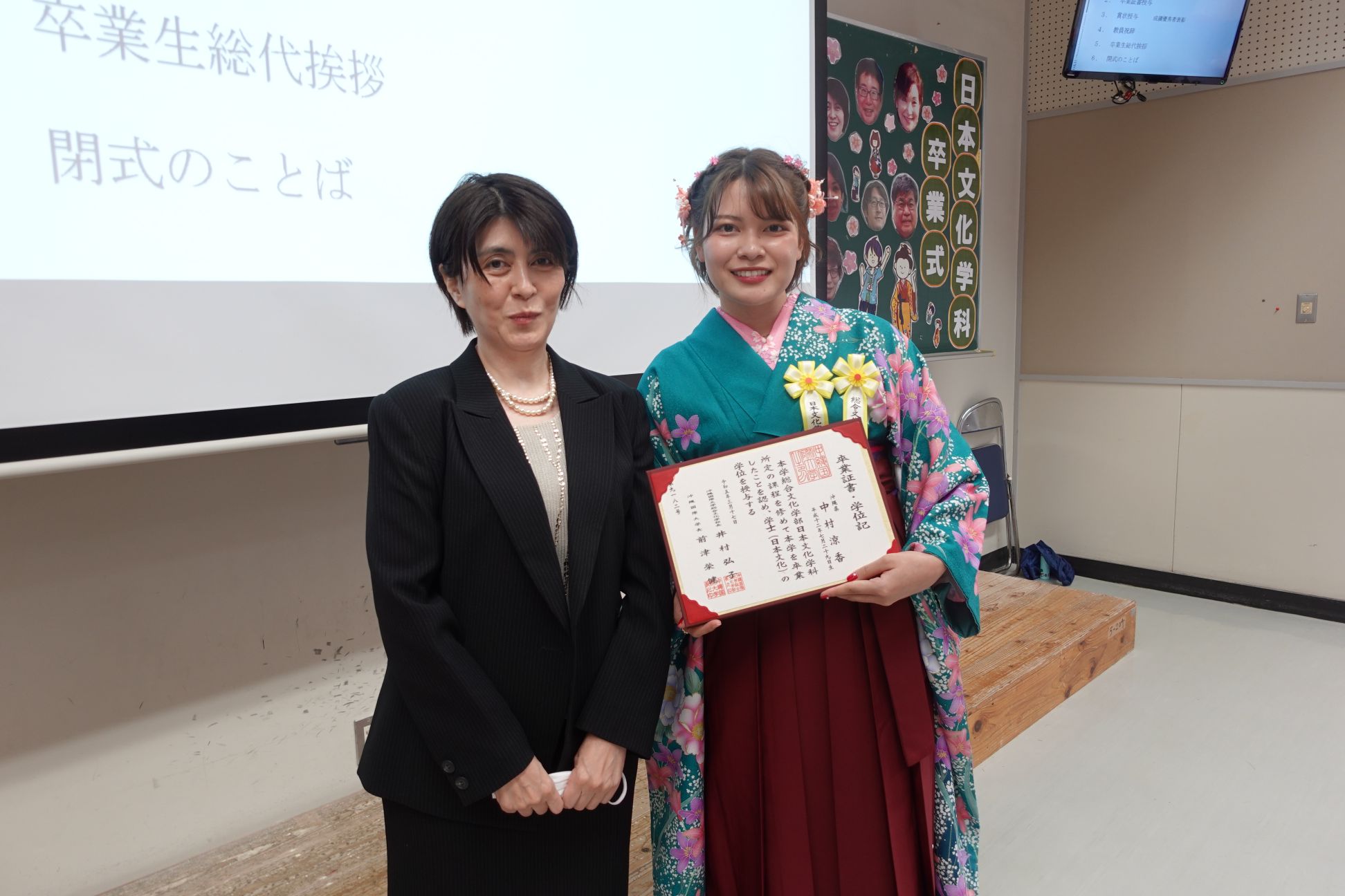 最後に、桃原学科長からは、「体が縮こまってしまうようなつらい状態でも、それはいつか来るチャンスに備えて、高く高くジャンプするための大事な時間です。つらいときほど自分を大切にして、日本文化学科で身に付けた「ことばの力」を生かして、社会で活躍されることを願っています」というエールもありました。