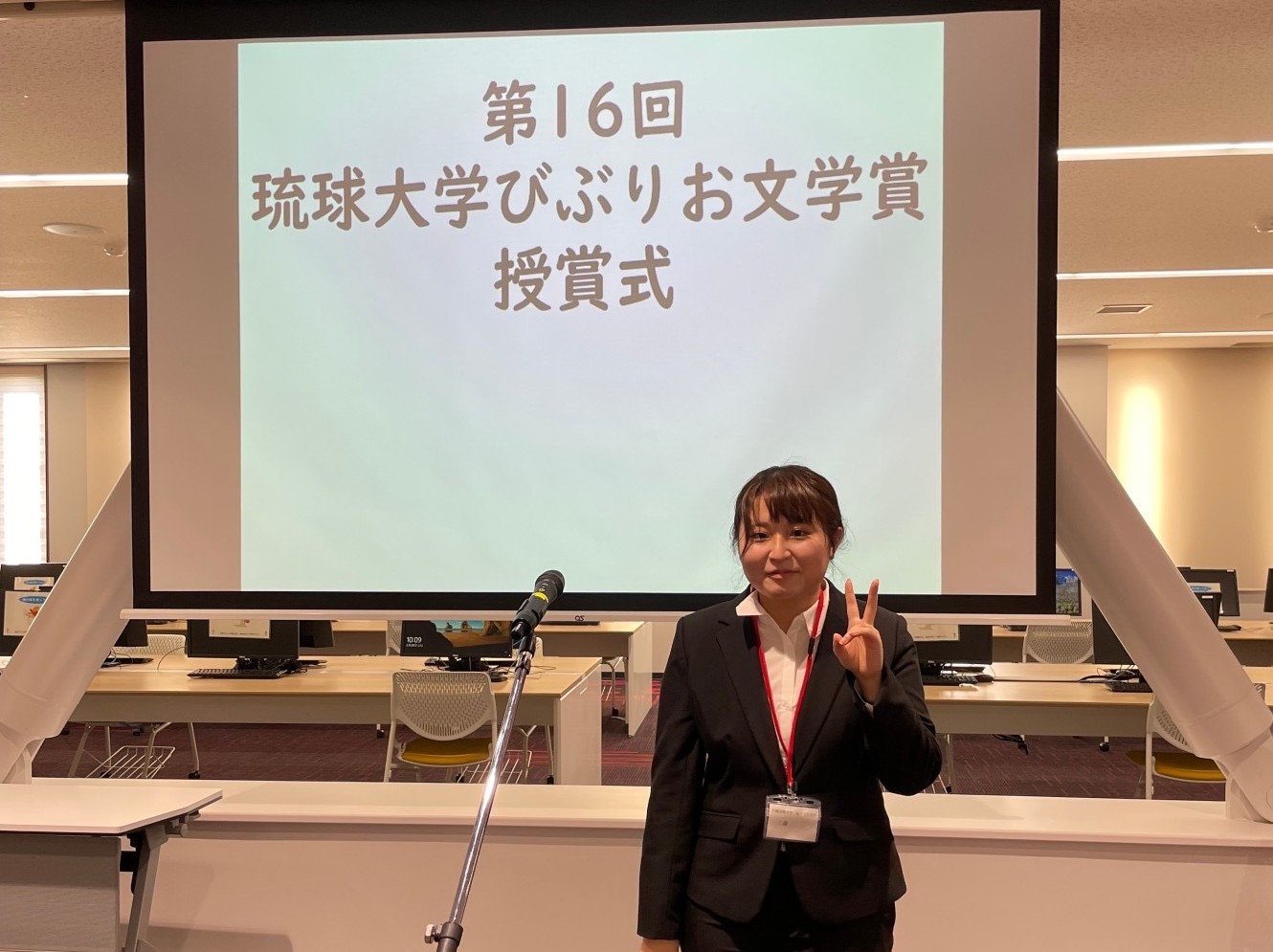 先日も、琉球大学附属図書館が主催する「びぶりお文学賞」の、難関部門である小説部門で佳作を見事受賞しています!