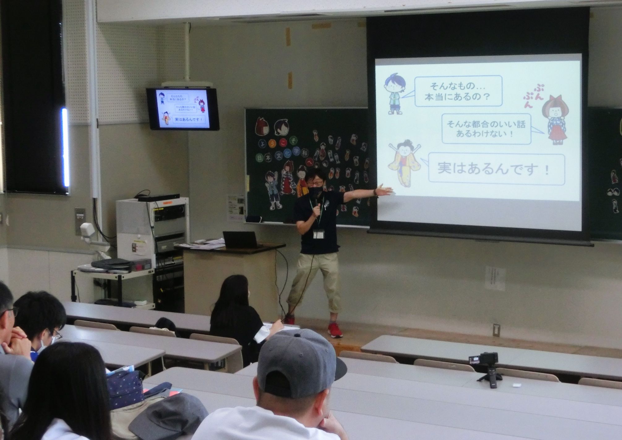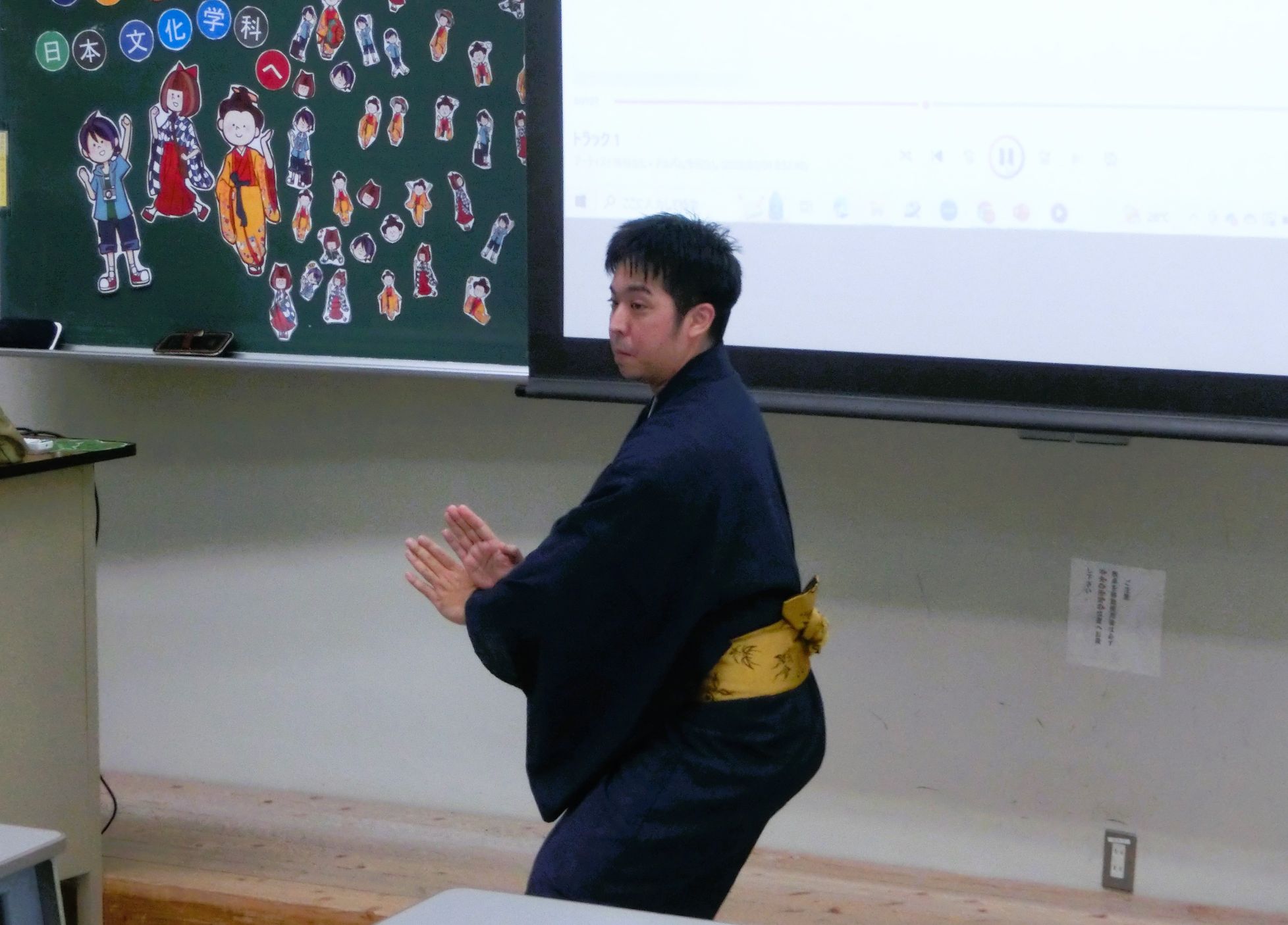 どちらの講座も日本文化学科での学問領域の幅広さを感じさせる面白い内容で、我部先生は舞踊を実際に踊ってみて、身体表現を通して芸能の特徴を解説してくださいました。
