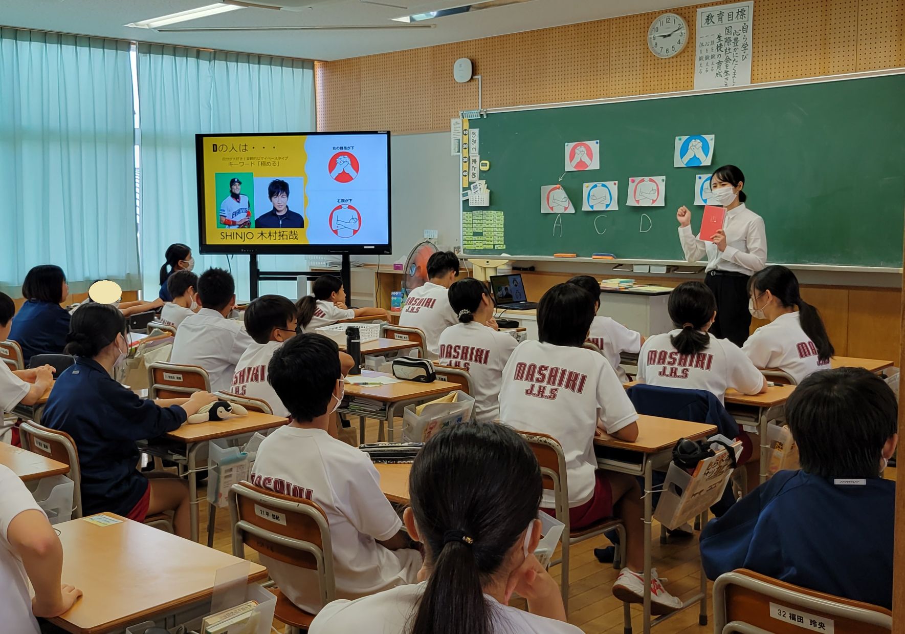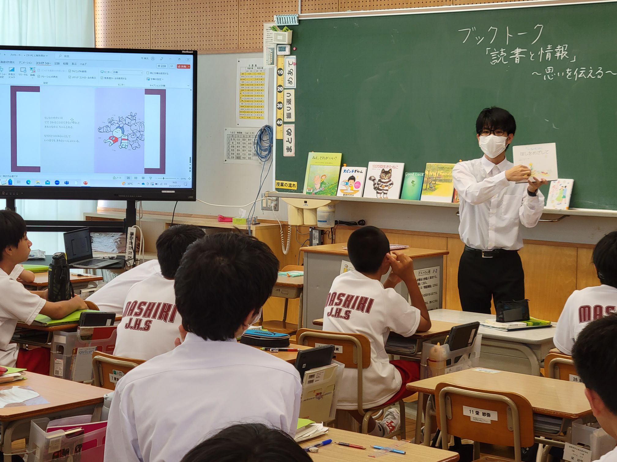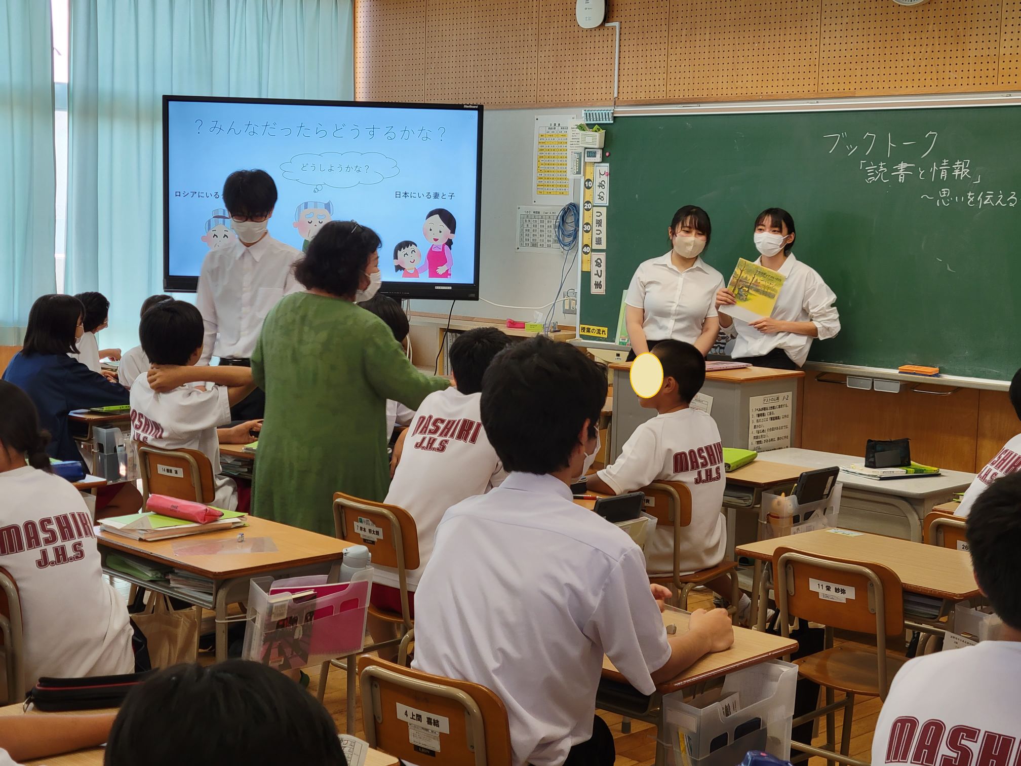 2023年7月12日(水)、松川まゆみ先生・田名洋子先生のご指導の下、宜野湾市の中学校の先生方のご協力を得て、1年生の国語の授業にお邪魔して、司書教諭と学校司書の資格取得を目指す4年生26名が「ブックトーク」を行いました。