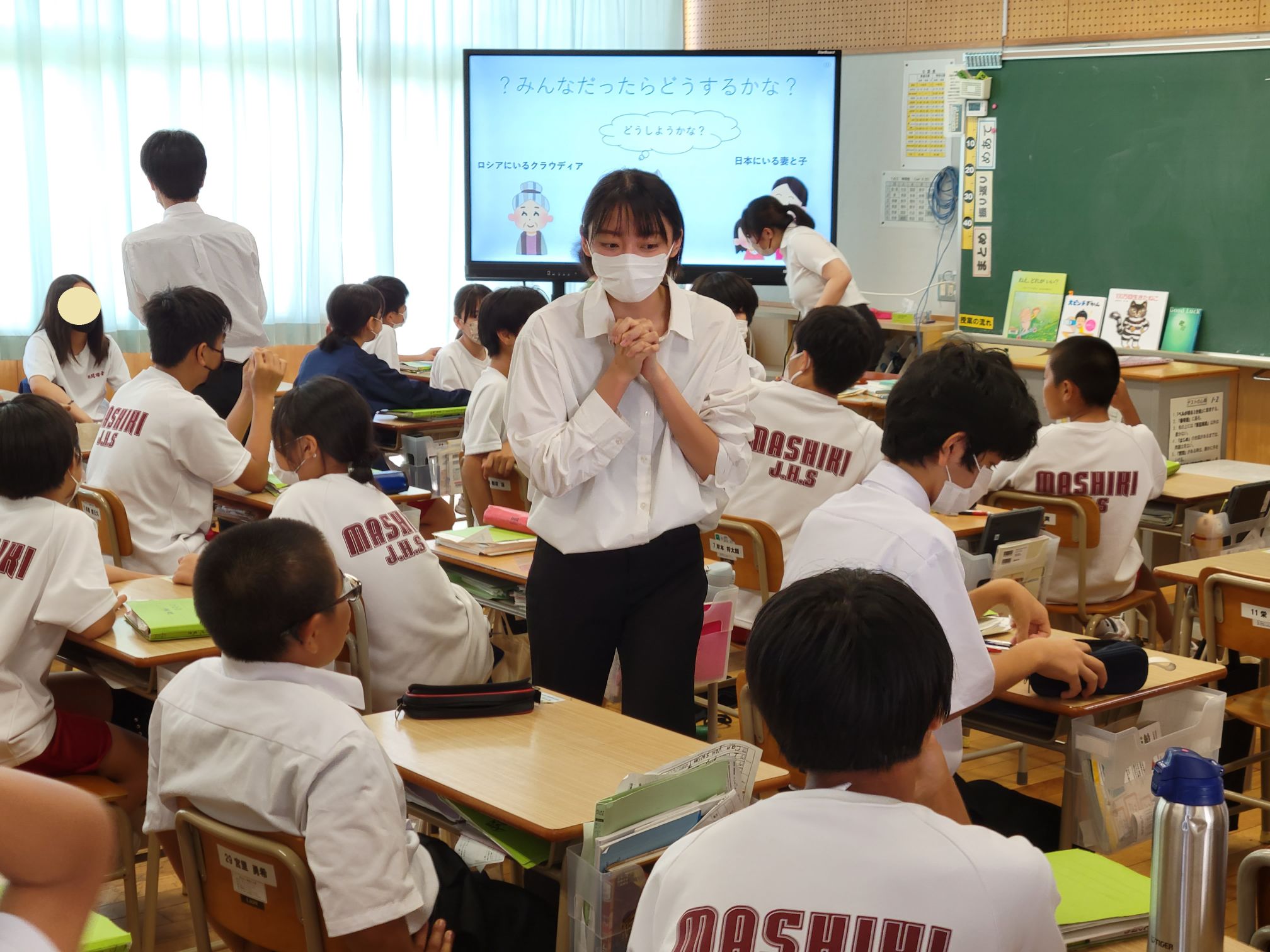 今回の実習は「かくれた自分」「選択」「こころ」「ふしぎ」「食物」「いろいろな生き方」「星」「宇宙」「ゆめ」といったテーマで、1クラス当たり2~3名が1チームとなって、50分の授業を担当しました。