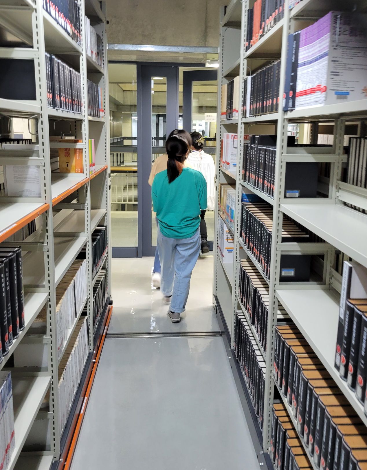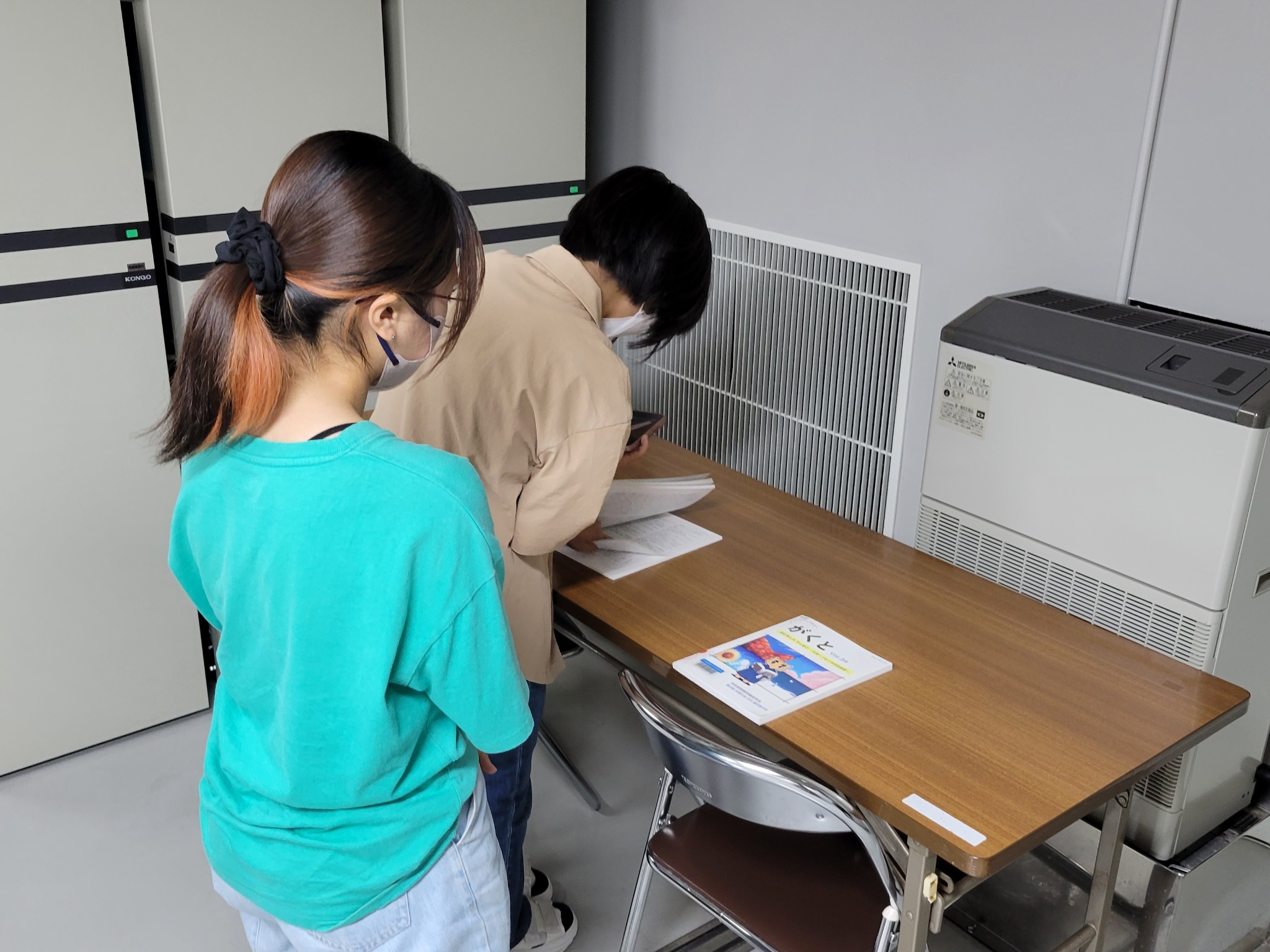 1年生からは、雑誌ばかりが置いてある地下書庫には初めて入る学生も多く、「図書館にこんな場所があったんだぁ」「迷路みたい」「雑誌の過去の号は製本されて1冊になっているんだぁ」などなど、新しい発見がいろいろあったようです。