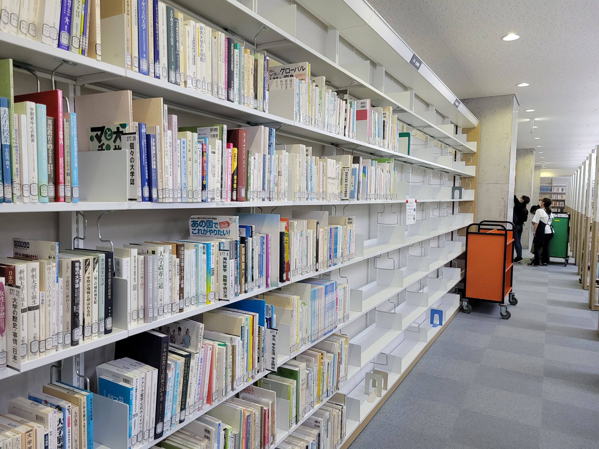 例えば、分類番号が371⇒372のように、大きく変わるところではできるだけ段を変えたり、それが難しいときは著者記号のアルファベットは同じ段に入れるように工夫したり。最上段には手が届きにくい利用者もいるのですが、最上段も使わないと資料が収まらないので、どうしても使う場合は、取り出しやすい軽めの資料を置くようにしたりしました。