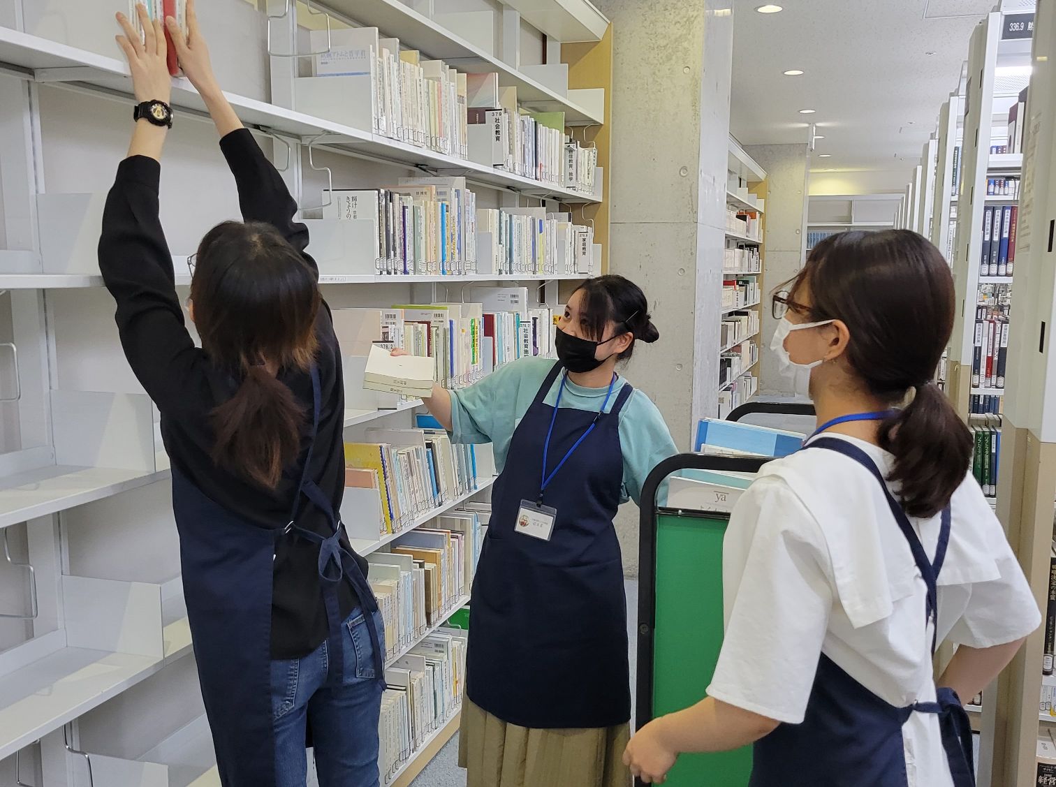 沖縄国際大学図書館では、司書課程の学生を対象として「排架アルバイト」を募集して、授業の合間などに週あたり2~3日の返本と書架整理業務を担当してもらっています。
