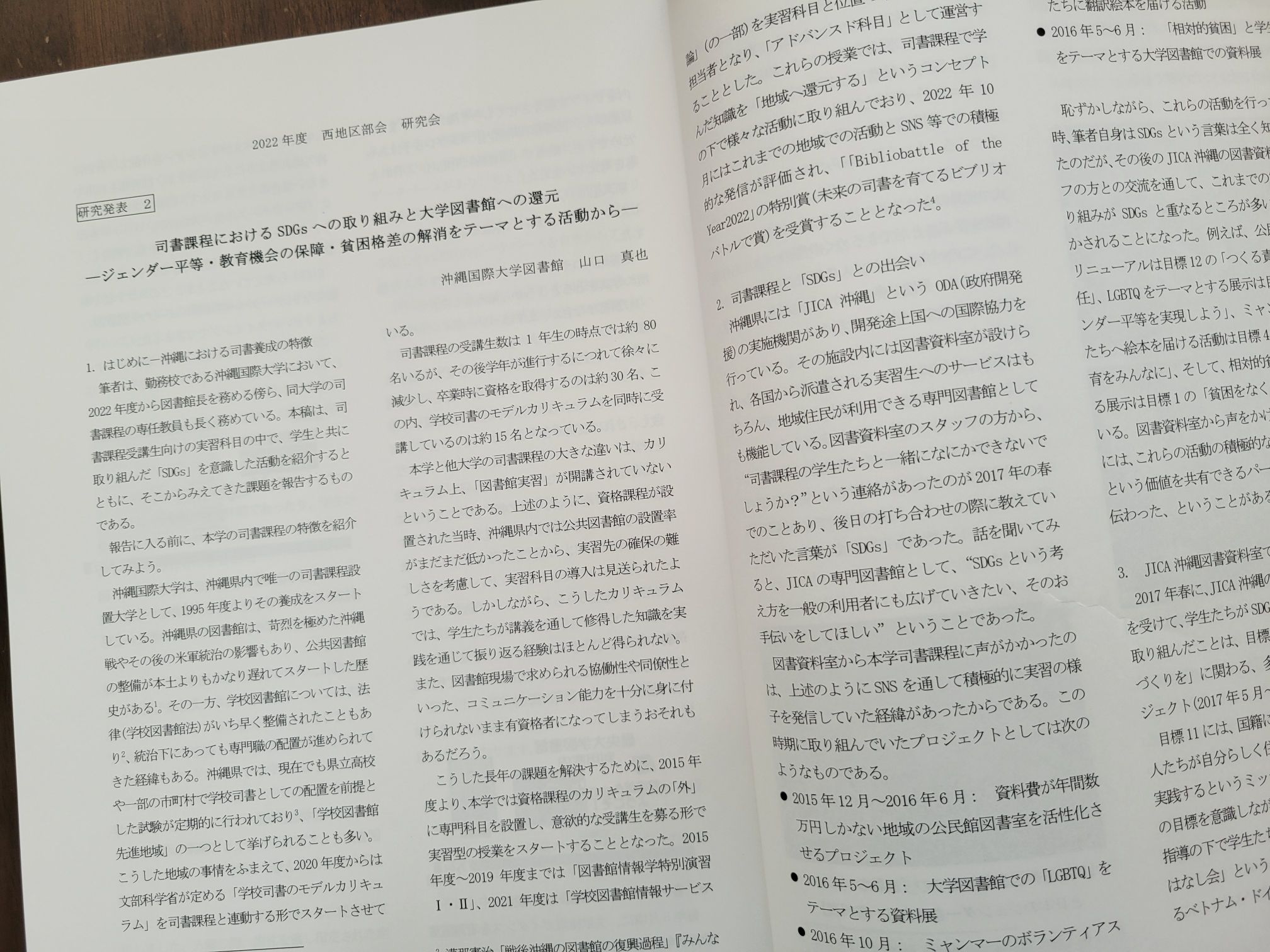 その様子の一部が、2023年9月に発行された『私立大学図書館協会会報』(160号)という冊子に、「司書課程におけるSDGsへの取り組みと大学図書館への還元―ジェンダー平等・教育機会の保障・貧困格差の解消をテーマとする活動から」というタイトルで掲載されています。