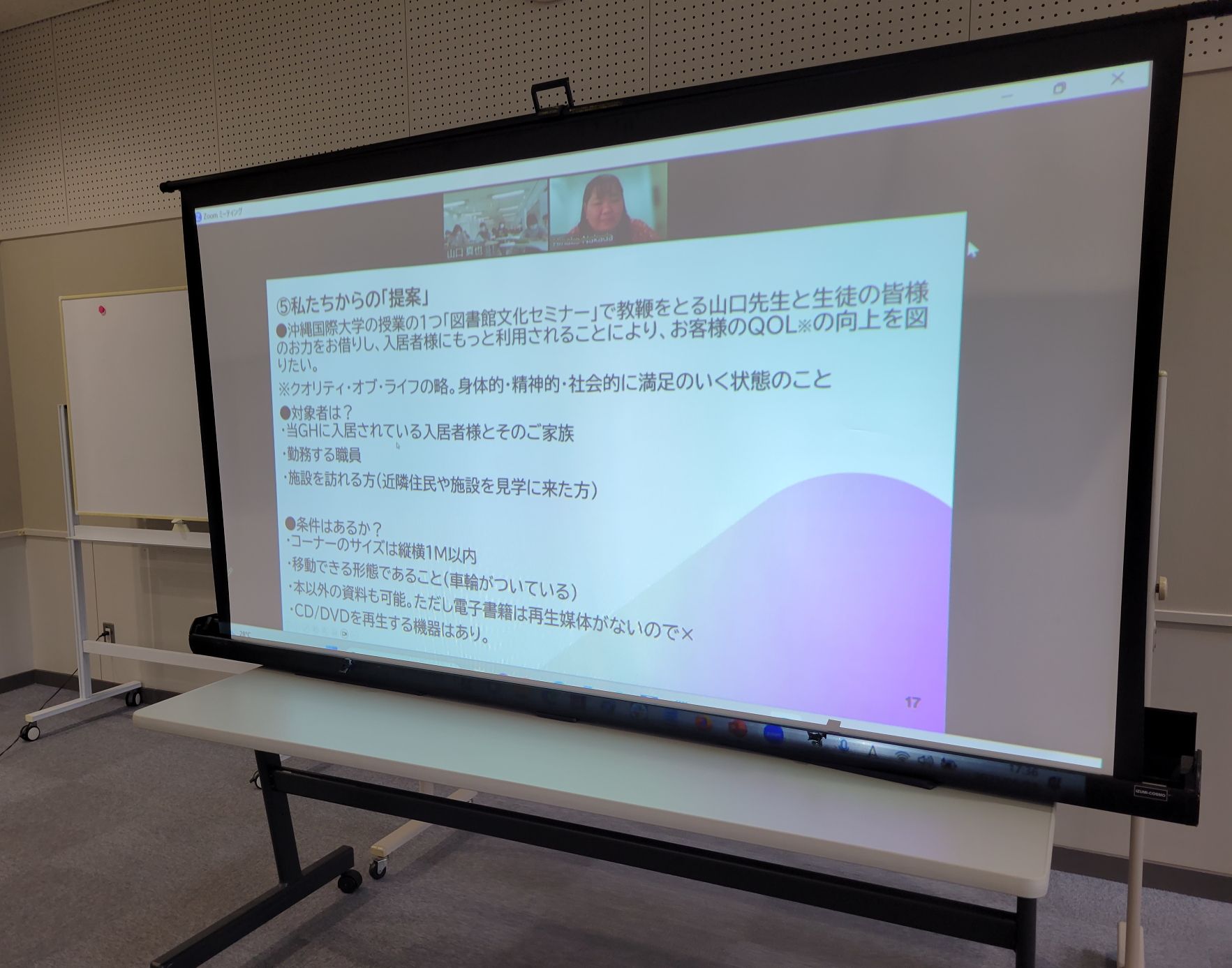 2023年9月28日の授業では、今回のオファーをいただいた株式会社アイ・ディー・エスの職員である仲田さん(日本文化学科の図書館情報学ゼミの卒業生)と、神奈川県にある事務所をZoomでつないで、学生たちの質問に答えていただく形で、認知症とはなにか、グループホームとはどのようなものか、そして今回の文庫づくりに向けての要望など、さまざまなお話をお伺いしました。