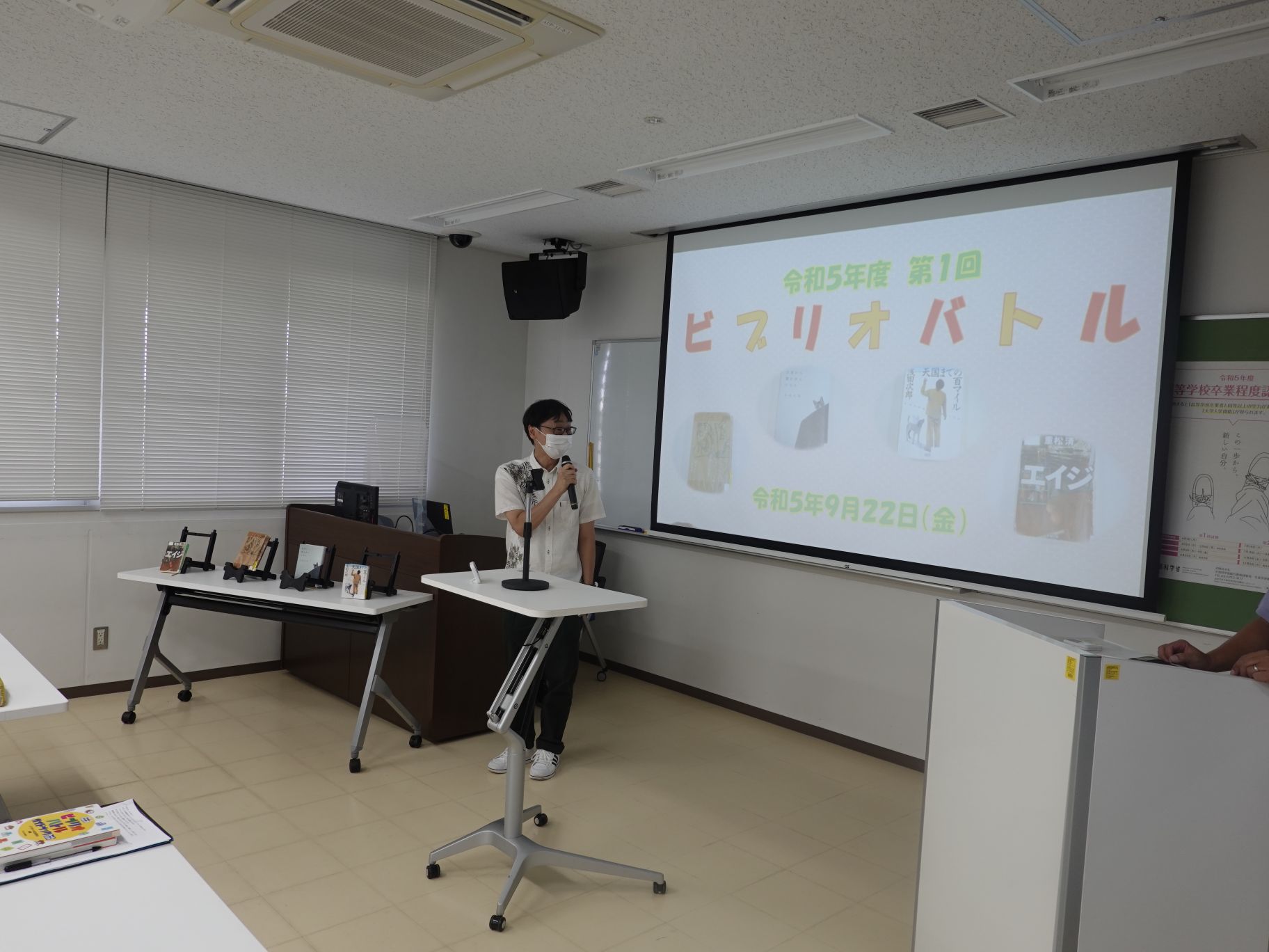 今回は、図書館情報学ゼミを担当している山口先生が講師として参加し、ビブリオバトル大会の開催前に、ルールのおさらいやバトルを楽しむためのポイントを紹介しましました。