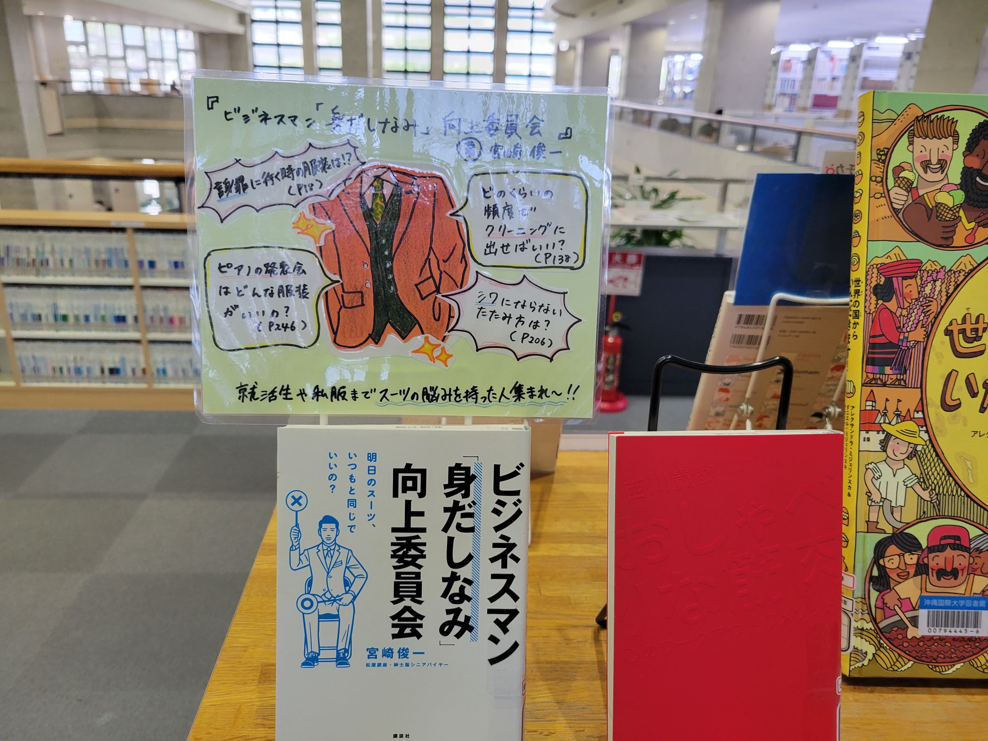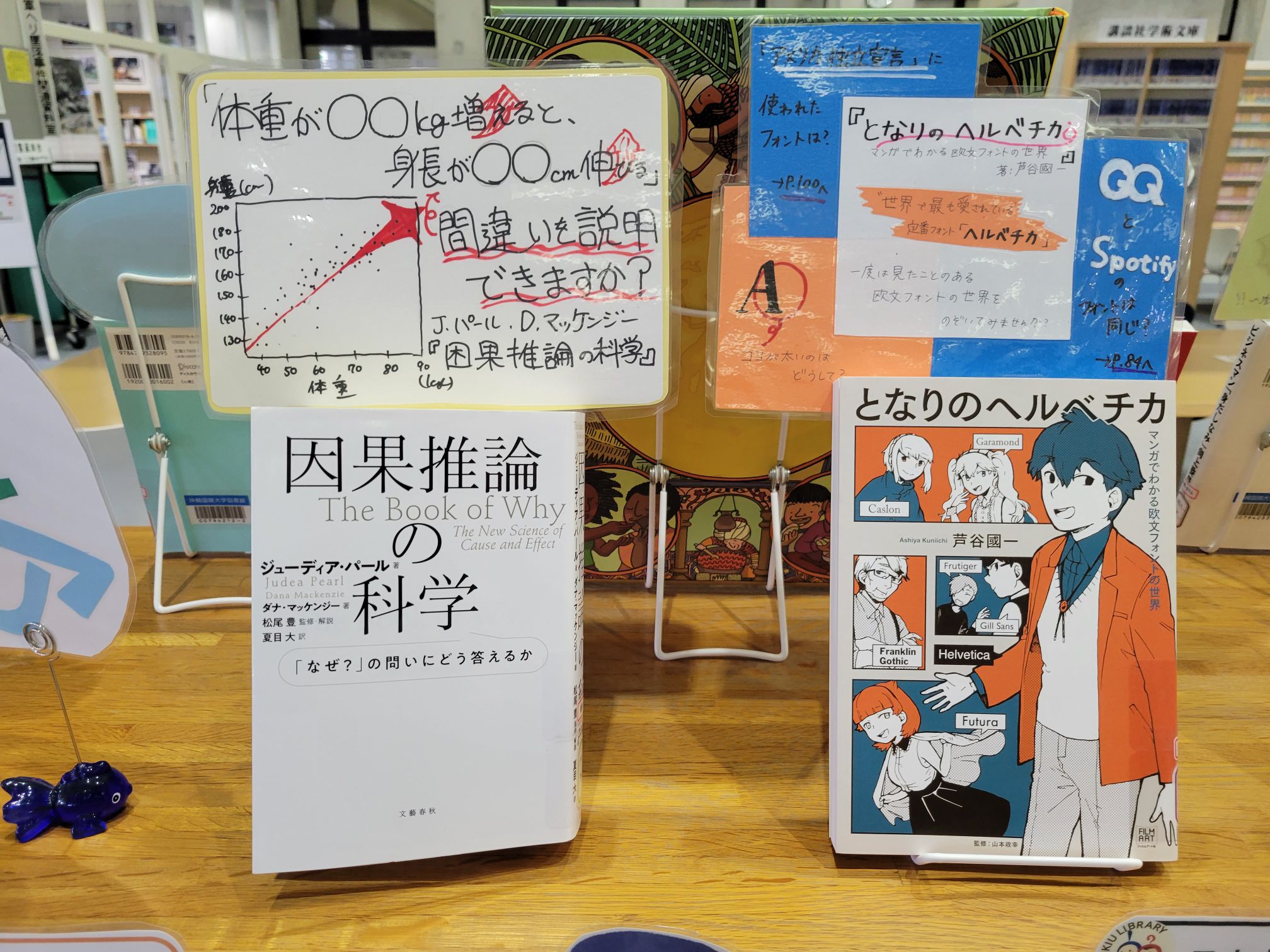 『ビジネスマン身だしなみ向上委員会』『小説 第4次産業革命』『心の容量が増えるメンタルの取扱説明書』『語彙力図鑑』『となりのヘルベチカ』『鳥獣戯画のヒミツ』『因果推論の科学』『環境破壊図鑑』などなど、学生たちがだれかを思って選んでくれた、面白そうな本がいっぱいです。