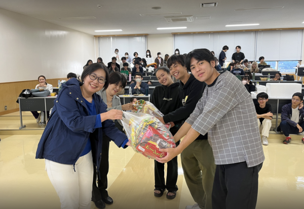 11月25日・26日の2日間の大学祭での舞台上演に向けて、11月22日14時頃、リハーサル中の1年生の皆さんを、日本文化学科の有志の先生たち(村上先生、田場先生、桃原先生)で激励に行ってきました。