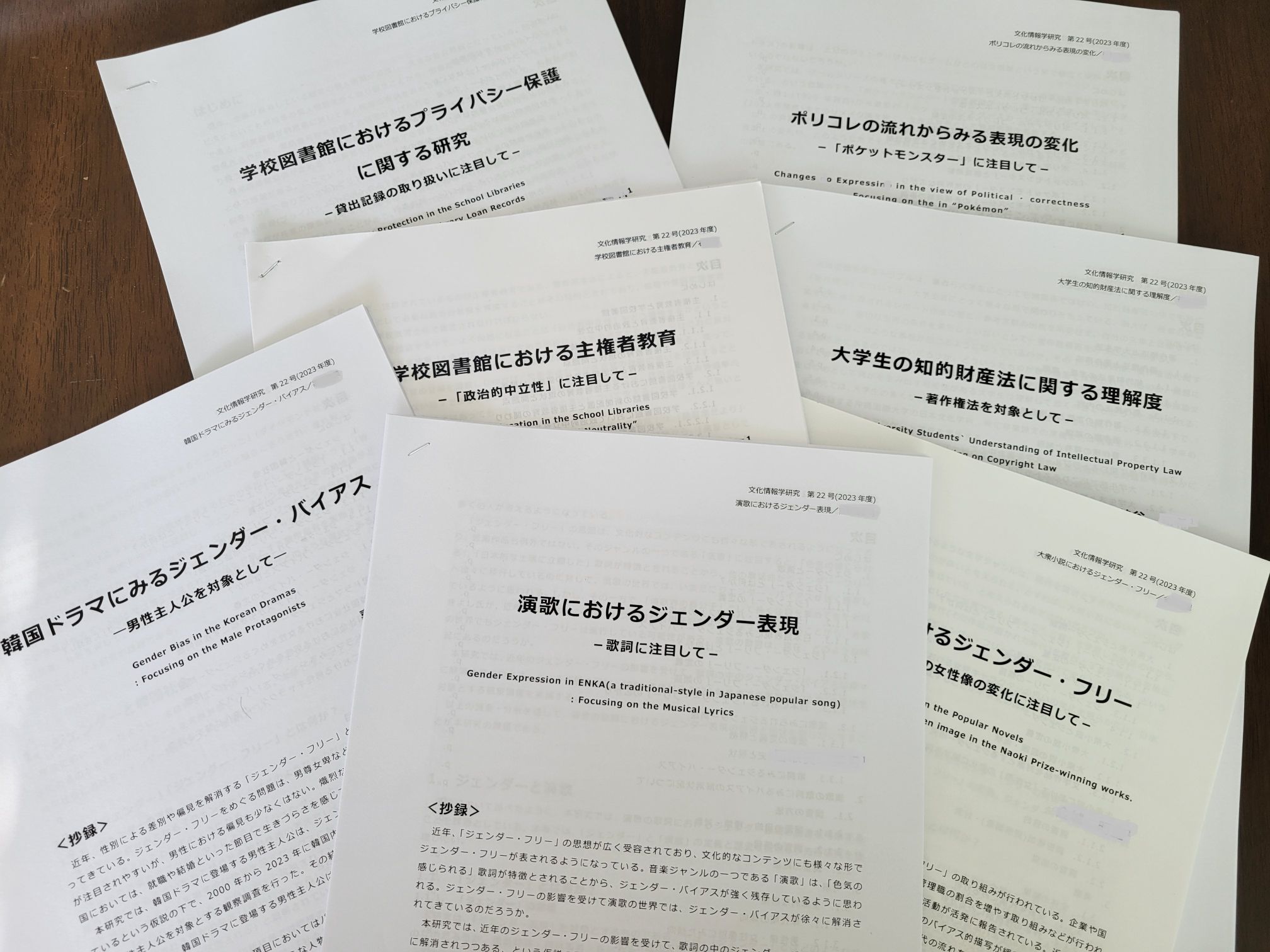 日本文化学科では卒業論文の執筆が全研究室で必修となっており、日本語学・言語学、国語教育学、日本文学、琉球語学、琉球文学、古典芸能、日本語教育学、サブカルチャー論(アニメ・マンガ・映画等)、多文化間コミュニケーション論、図書館情報学、出版流通問題などなど、専門科目で学ぶ知識を土台として、各自が様々な興味関心に応じて自由にテーマ・題材を設定し、仮説を立て、インタビューやアンケート、観察・実験等を通してそれを検証し、分析していくスタイルで行われています。