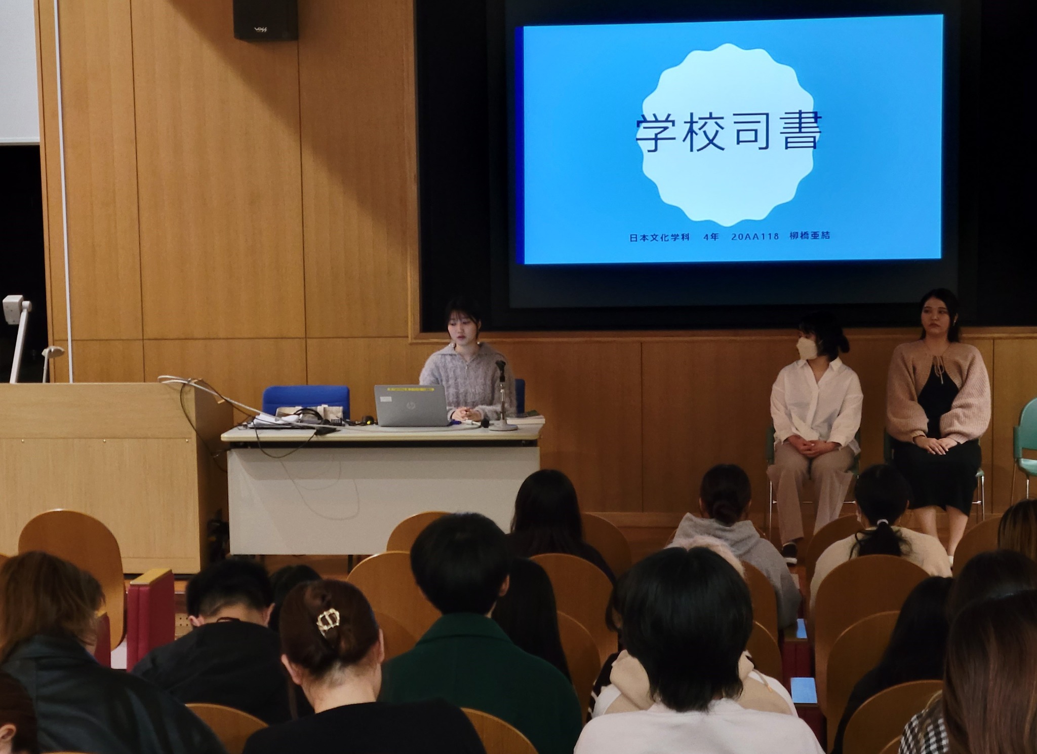 日本文化学科では、1年生の必修科目「リテラシー入門Ⅱ」にて、毎年、専門職として活躍されている卒業生や進路が決まった4年生をゲストとして招いて、仕事の魅力、進路の決定方法、大学時代の過ごし方などをお話しして頂ています。