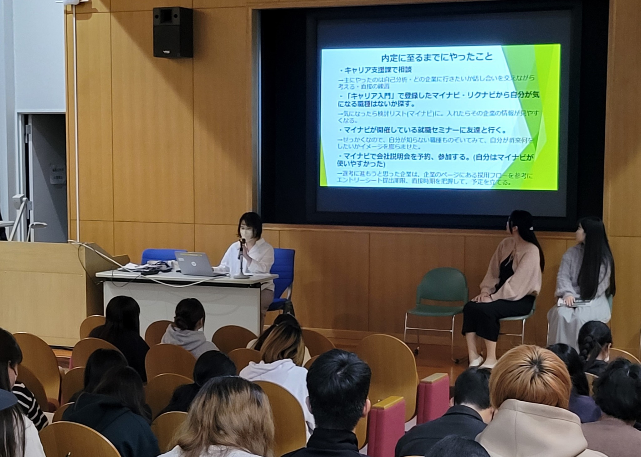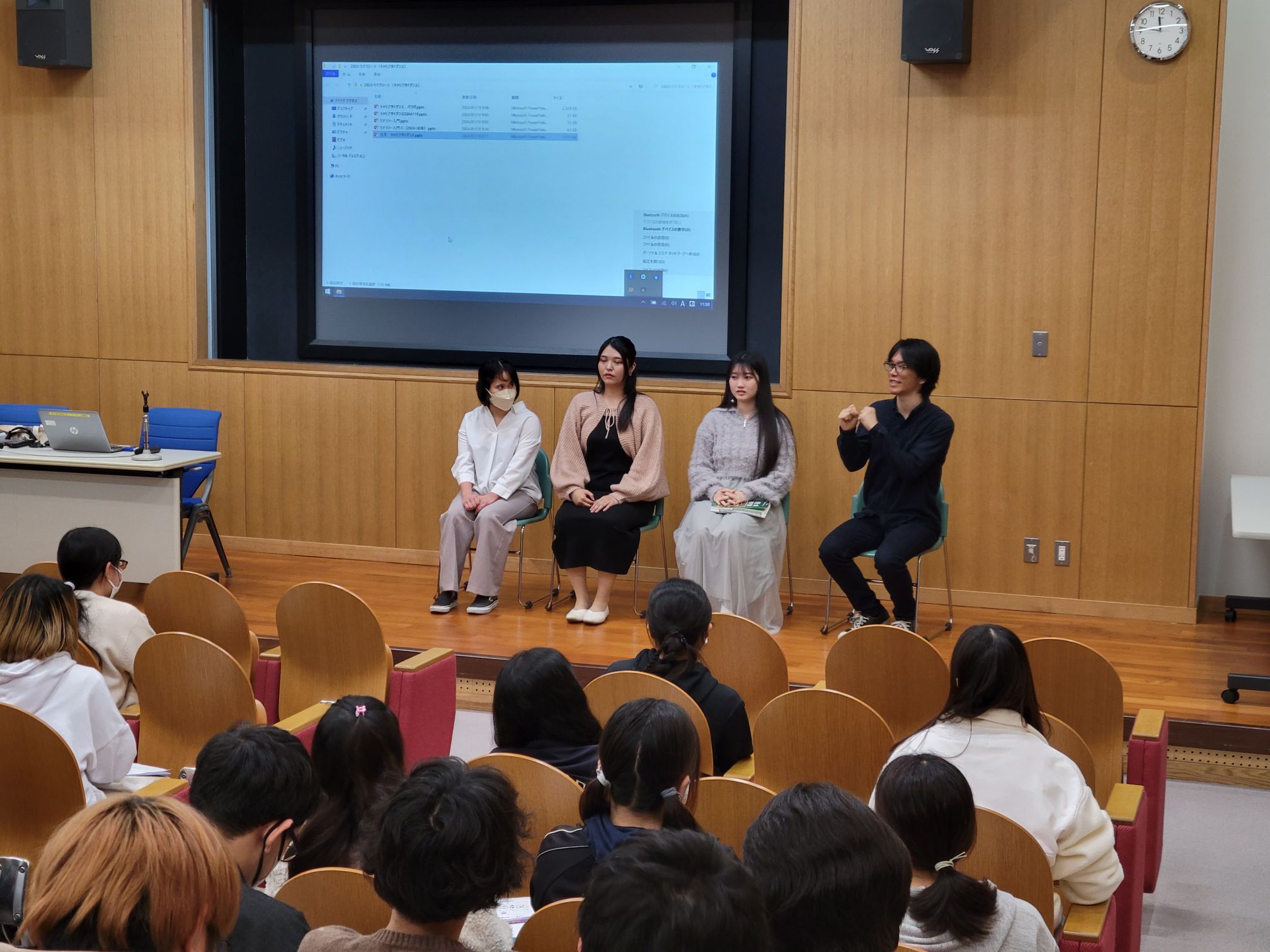 ガイダンス終了後も多くの学生が先輩たちを囲んで質問する場面もみられ、1年間のまとめの授業として、本日のガイダンスからたくさんの学びがあったようです。