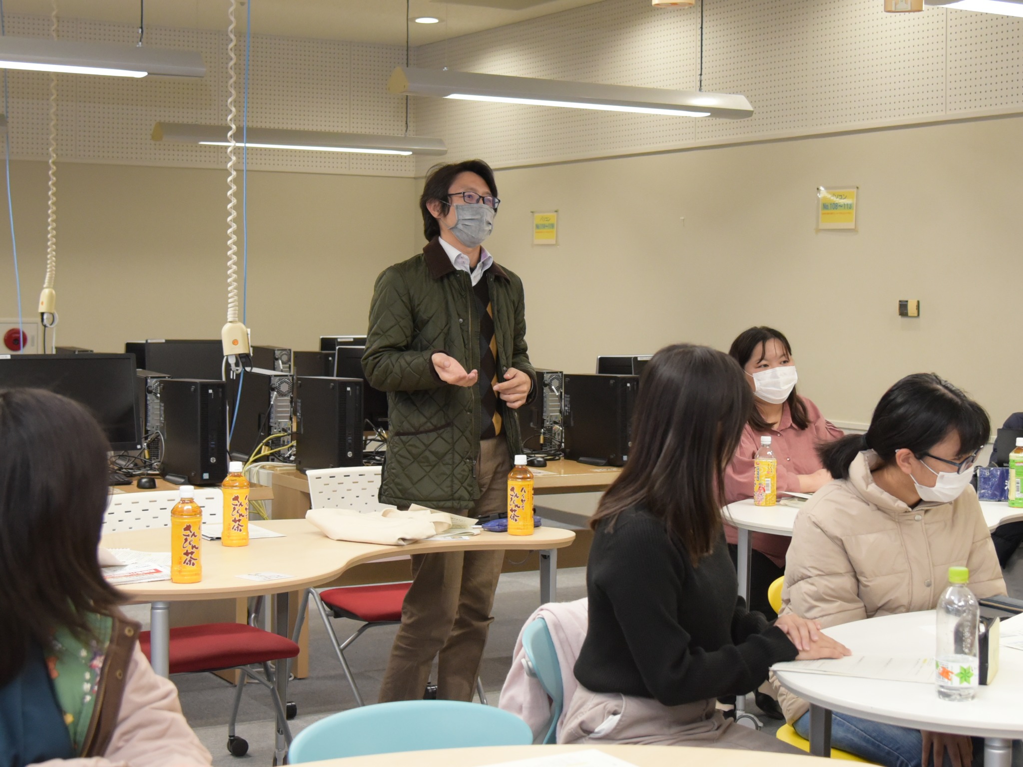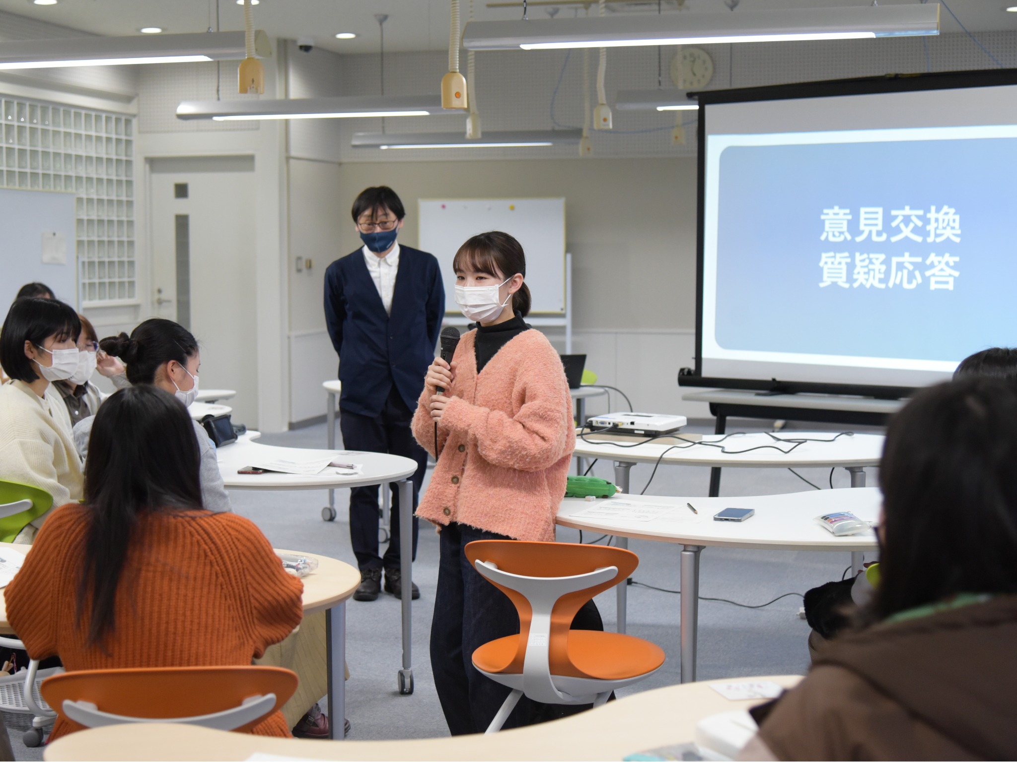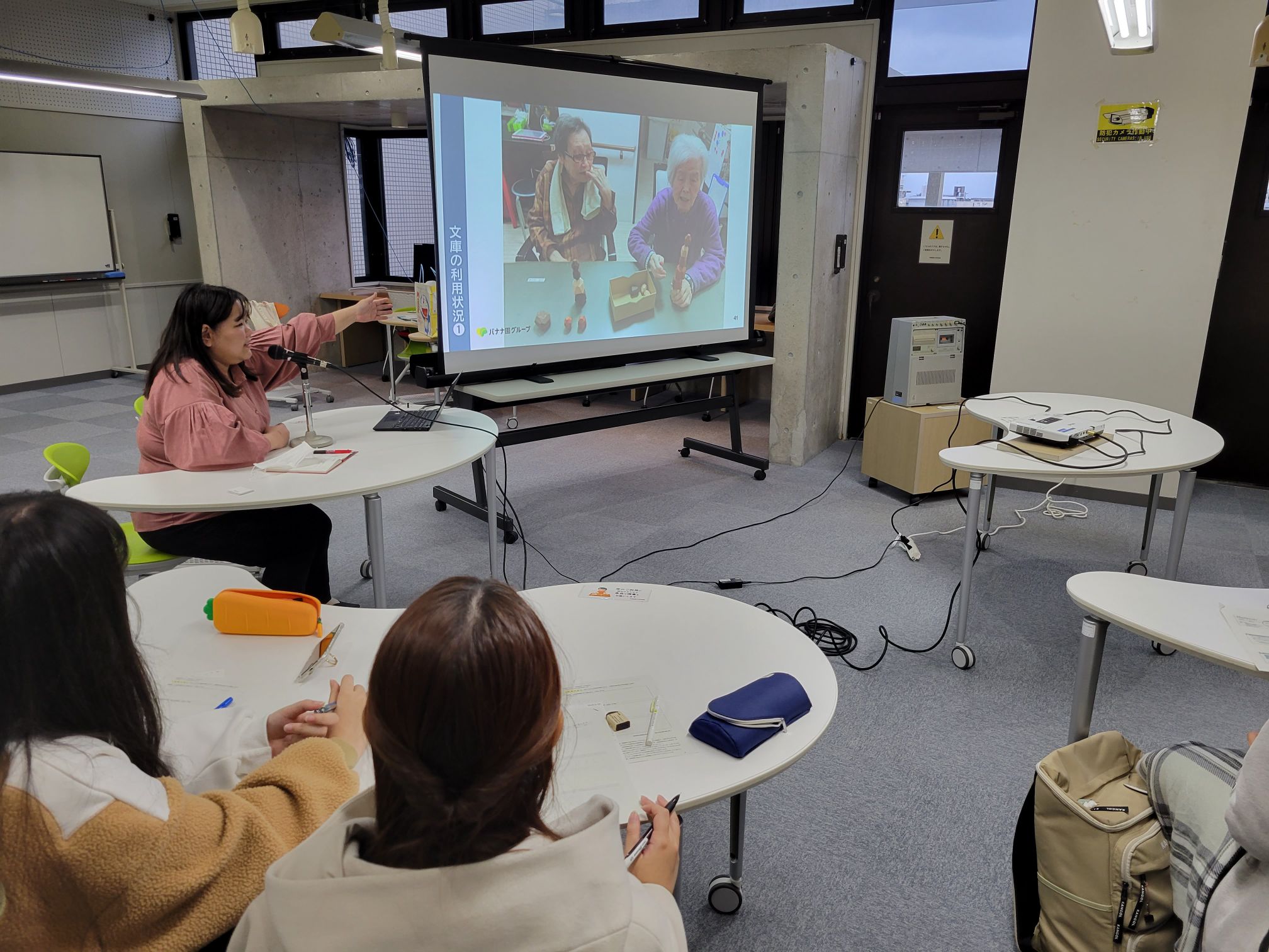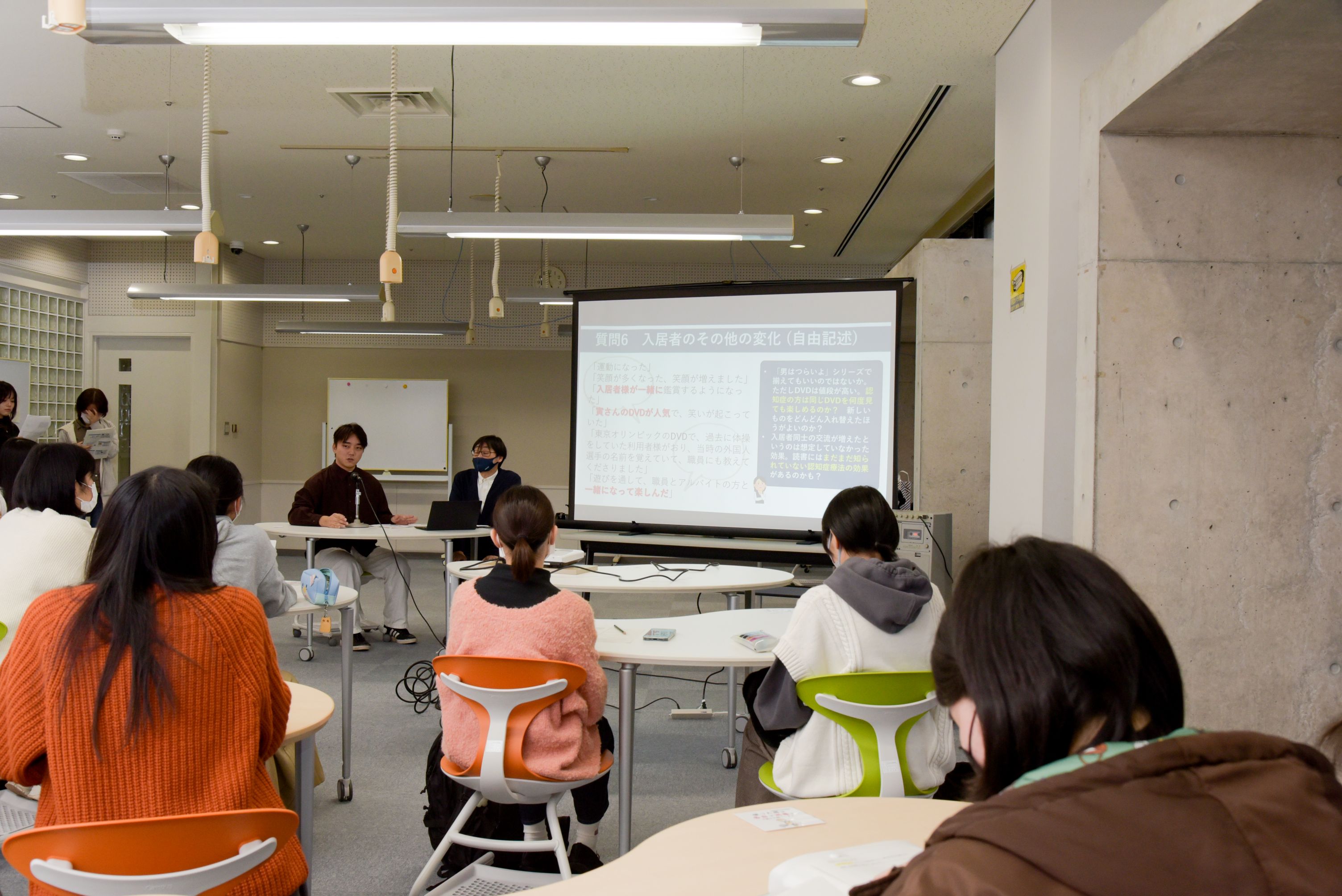 この報告会では、本学において図書館情報学を専攻した後、介護福祉士として社会福祉法人ばなな会にて働かれている仲田ひな子さんと学生たちが協力しながら取り組んだ、4カ月間のプロジェクトの成果発表を行いました。