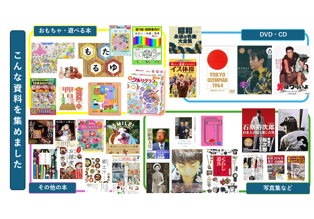 「回想法」とは、認知症患者への非薬物療法のひとつであり、リハビリテーションとして介護現場で多く用いられています。回想法に使われるものとしては、古い道具類や家族アルバムなどが挙げられますが、図書館が所蔵している資料(昔懐かしい街並みやスターの写真集やDVD、音楽CD)なども、記憶の底に眠っていた過去の楽しい思い出を鮮やかによみがえらせ、脳が刺激され、認知症の進行を緩やかにする効果があるのではないかと考えられます。