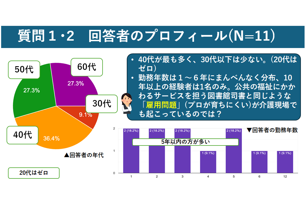 具体的には、学生たちを3グループにわけて、11月27日に神奈川県川崎市にあるのびりーす等々力での文庫づくりの実習の様子や、選書した資料の紹介、施設スタッフの皆様へのアンケートをもとに、文庫の使いやすさ・親しみやすさや、文庫設置による認知症の進行抑制効果について分析した結果を報告させていただきました。