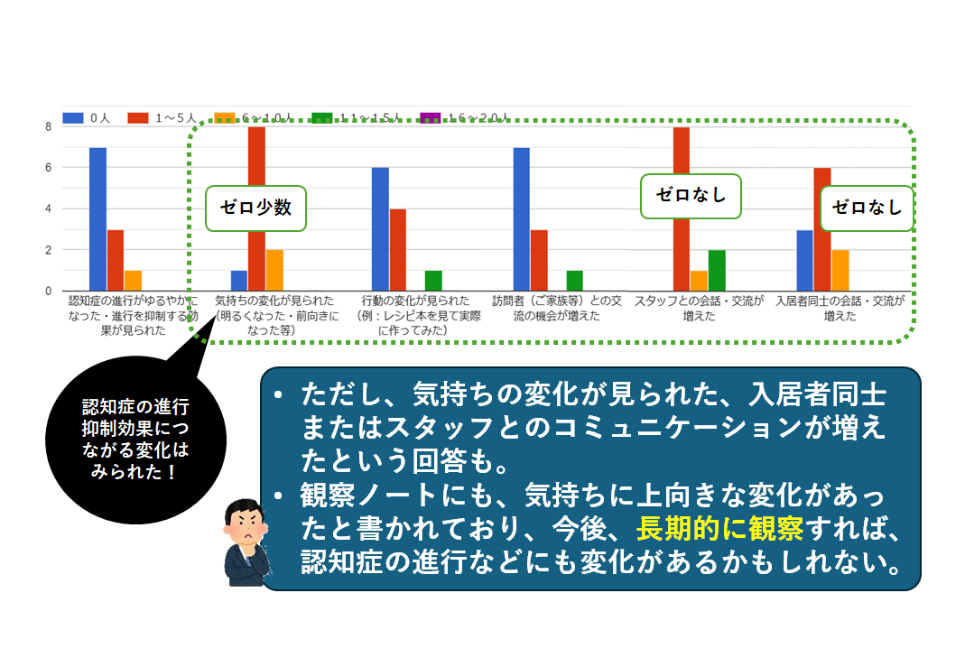プロジェクトのメインの目的であった、認知症の進行抑制効果については、11月末~1月中旬の短い期間でははっきりと読み取ることが難しい、という結果になりましたが、前向きな様子や笑顔が増えた、といった、認知症の進行抑制につながるような行動面、心理面での変化が入居者の方々にみられる、という回答がスタッフの皆様から非常に多く寄せられ、長期間、この文庫を設置することで、認知症の進行抑制という効果も高まってくるのではないか、と学生たちがまとめてくれました。