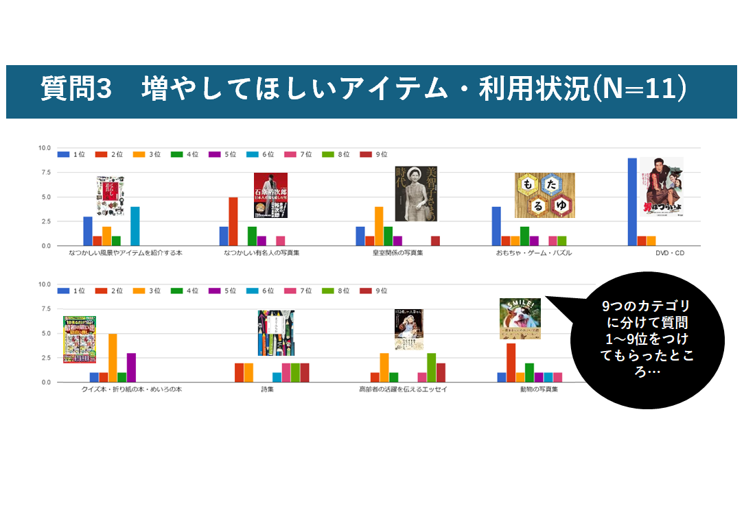 仲田さんからは、アンケート結果からは読み取れない、日々の利用の様子について、「アンケートによる検証が終わったら、文庫は返さないといけないの?」という心配があるほど、このコーナーが愛されていること、特に積み木が大人気で、どのくらい高く詰めるか、入居者の方同士が競ったり、協力し合ったりする様子が見られたこと、などを教えていただきました。