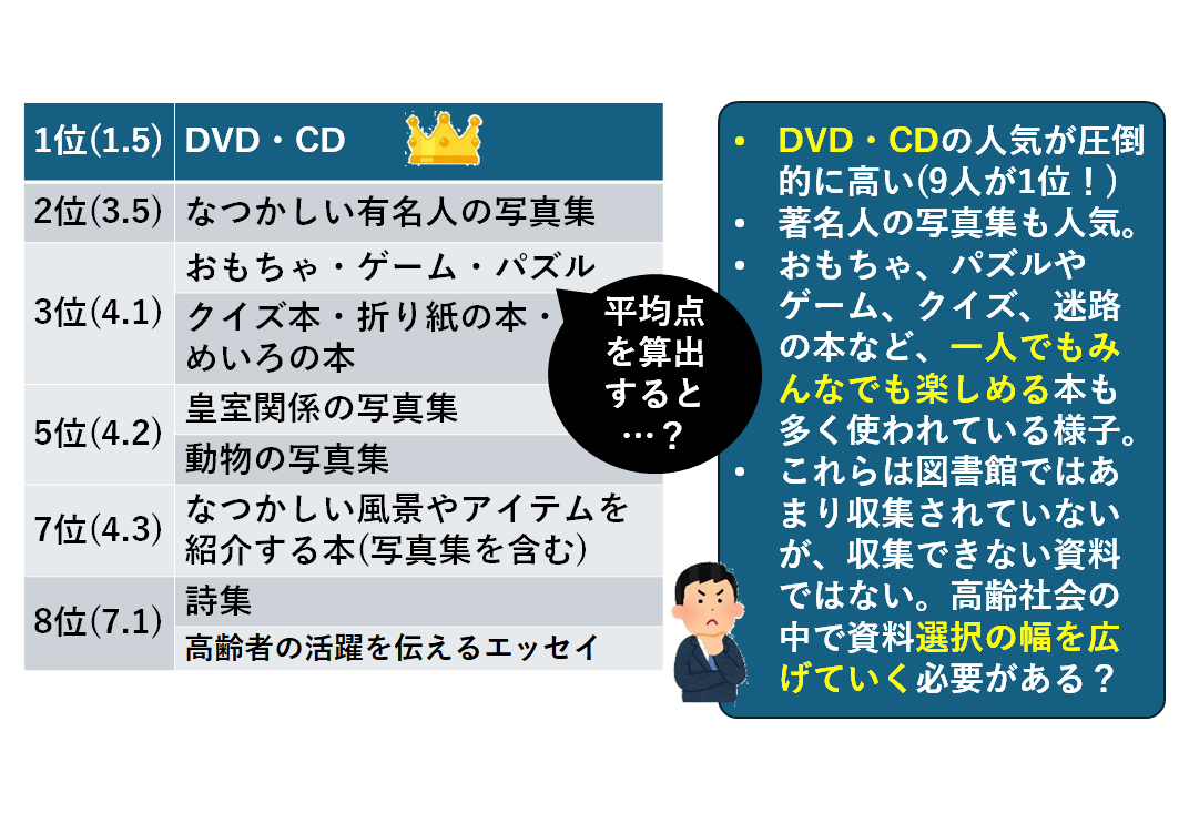 また、アンケートを分析した学生からは、「「男はつらいよ」の第1作のDVDが人気があったようなので、第2作、第3作をプレゼントしようかと話し合ったが、認知症の方にとって、そもそも資料の更新は必要なのか?、一度見た映画のことをどのくらい覚えていられるのか?」ということがメンバーの中で話題になった、という意見もありました。仲田さんからは、「認知症の方の症状にも多様性があり、一度見たもの、読んだものを忘れてしまう、というのは間違いです。また、小さな子どもはまだ絵本の内容が分からないからと言って、毎日、同じ絵本を読むお母さんはいないのと同じように、人として接する上で、同じものを与え続けていてよい、ということにはならないと思います。認知症の方の人権に関することととしても、読書や図書館サービスのあり方を捉えてほしいです」というメッセージもいただきました。