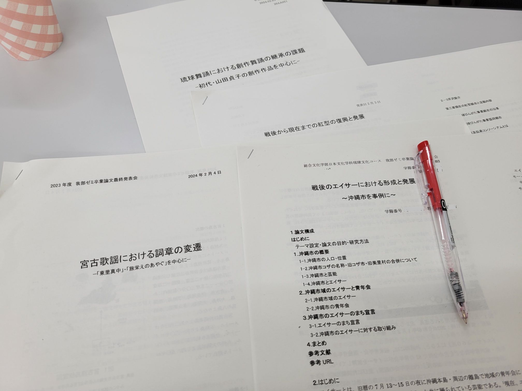 「宮古民謡における詞章の変遷」は、宮古島に三線の文化が入り、古謡が民謡として歌われるようになった際に、歌詞にどのような変化が見られるのか、という観点からの比較研究となっており、我部先生からは「神への祈りの場であった古謡が、人から人へ謳われる民謡に変化する中で、歌詞に叙事から抒情という変化がみられる、という指摘は今後の歌謡研究においてとても重要で、オリジナリティのある卒論になっていると思います」とのコメントが寄せられました。