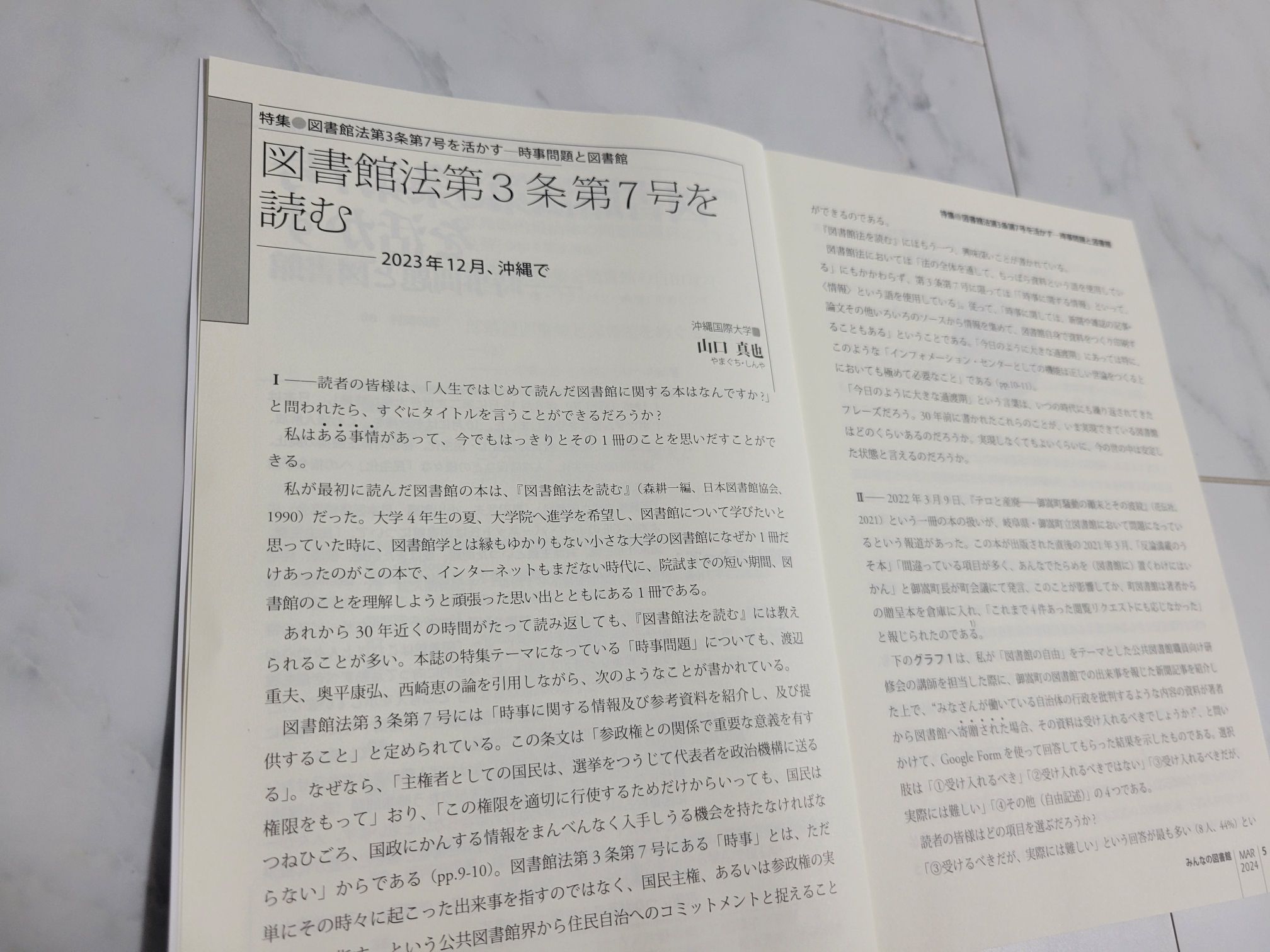 『みんなの図書館』3月号の特集である、「図書館法第3条第7号を活かす――時事問題と図書館」の中の一編として書かれたもので、2022年から2023年にかけておこった岐阜県御嵩町図書館での寄贈本をめぐる事例を手がかりに、時事問題、特に、政治的な課題を扱った資料の収集・提供のあり方について、山口先生の専門でもある「図書館の自由」をからめながら論じたものになっています。