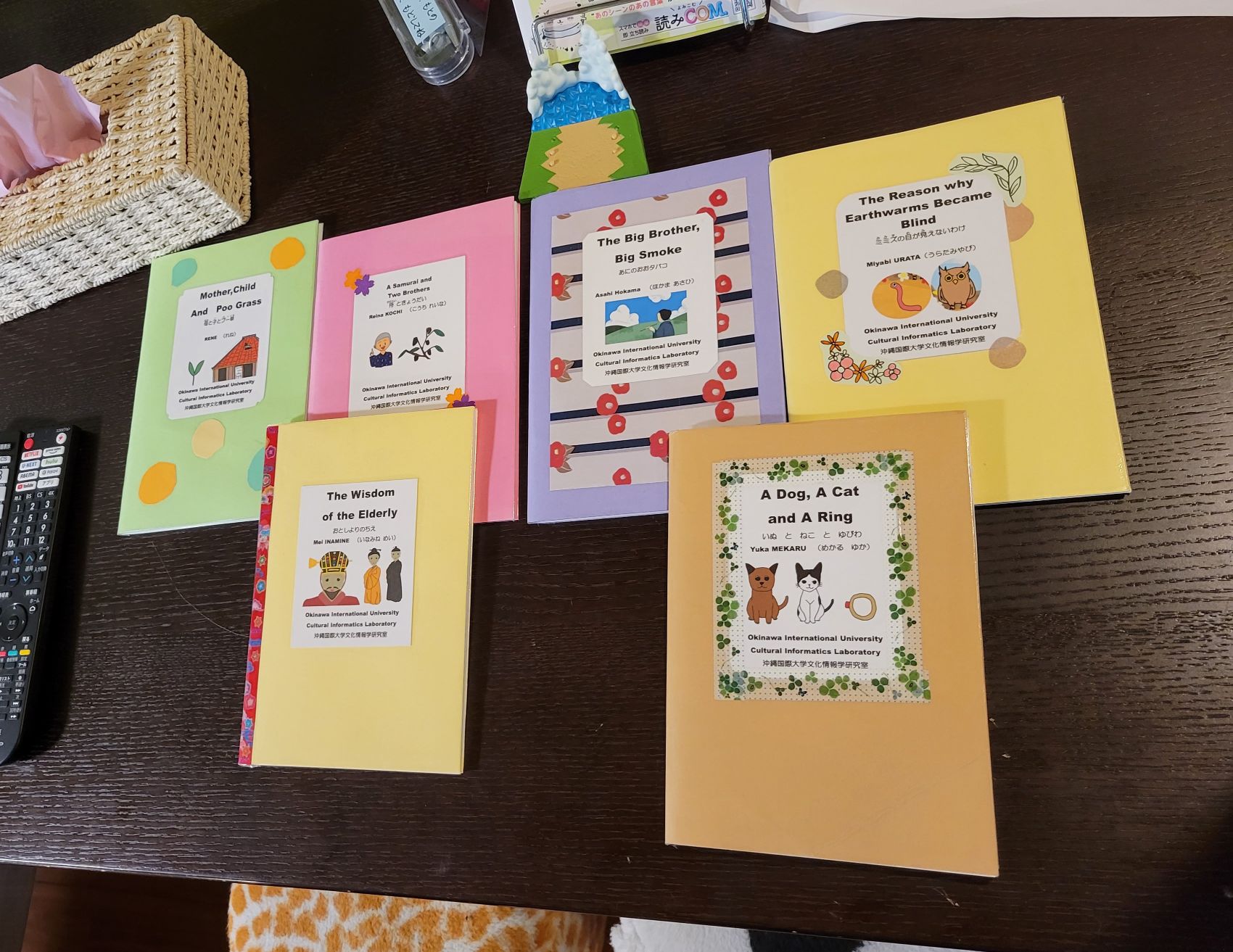 前期の授業は沖縄国際大学日本文化学科の先輩たちが集めた民話集をもとに、子ども向けの内容にアレンジする作業、アニメーション用のシナリオ作成、アフレコ、イラスト作成などの作業を通して紙芝居形式のアニメーションを作成、さらに、後期の授業では、アニメーションをブラッシュアップして英語字幕入りのYouTubeに公開、さらに、アニメーションのイラストをもとにした英語版(日本語訳つき)の絵本を作成して、県内の児童施設に届けるという取り組みを行っています。