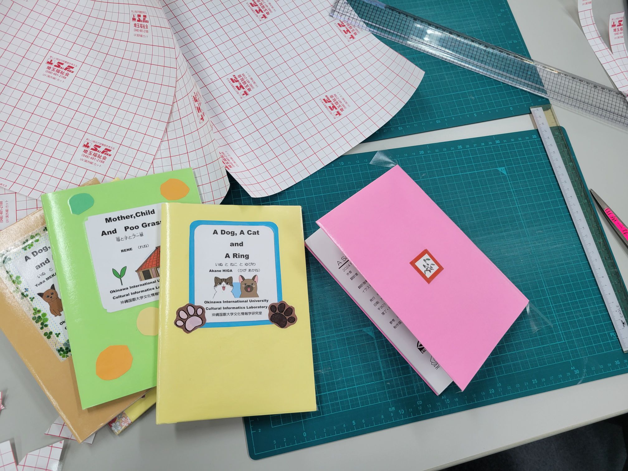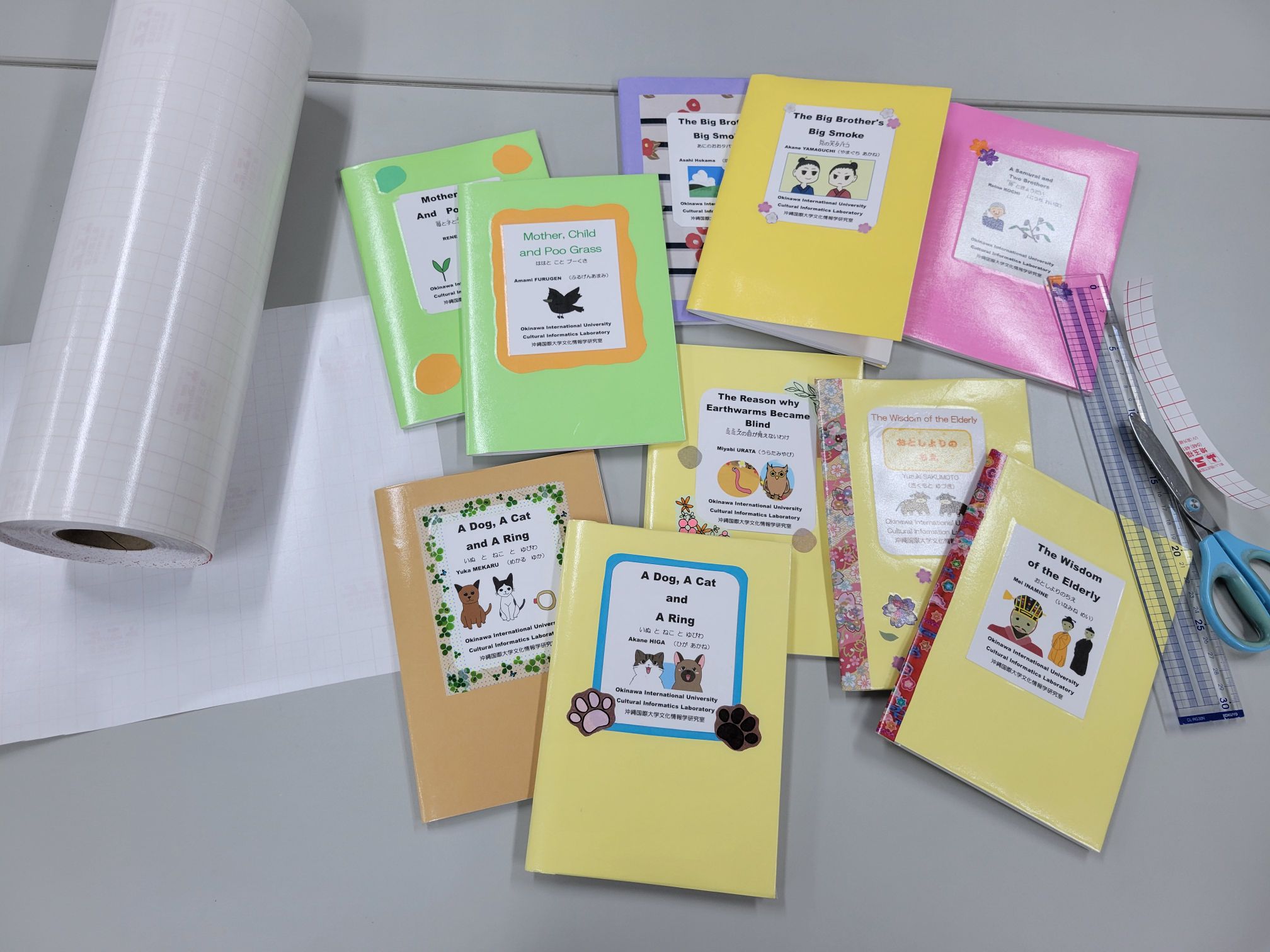 沖縄国際大学図書館の司書スタッフの皆さんに指導していただきながら、試行錯誤しながら、なんとか6タイトル、11冊の絵本にビニールコートをかけてお届けしたところ、「きれいに貼れてますね」「手作りと聞いてましたが、とてもしっかりできていますね」と喜んでいただきました。