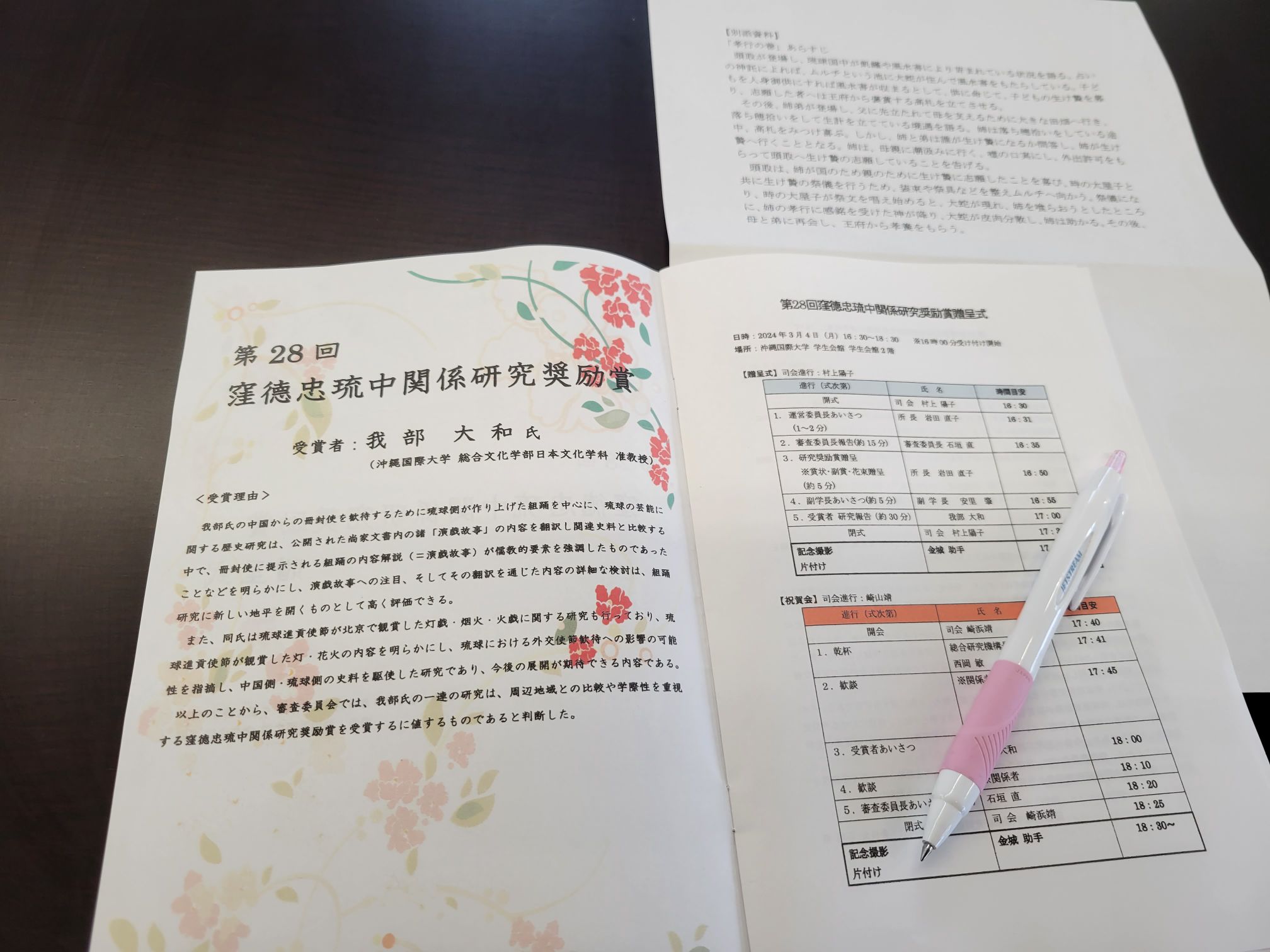 2024年3月4日、沖縄国際大学学生会館にて「第28回窪德忠琉中関係研究奨励賞贈呈式」を開催され、南島文化研究所所長である岩田直子先生から、受賞者である我部大和先生への賞状と副賞の進呈、さらに我部先生による研究報告も行われました。
