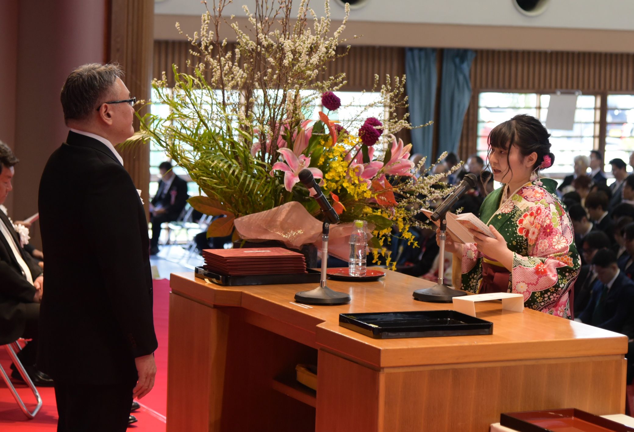 【沖縄国際大学卒業式にて、卒業生を代表して日文4年生の石川さんが答辞を述べました】