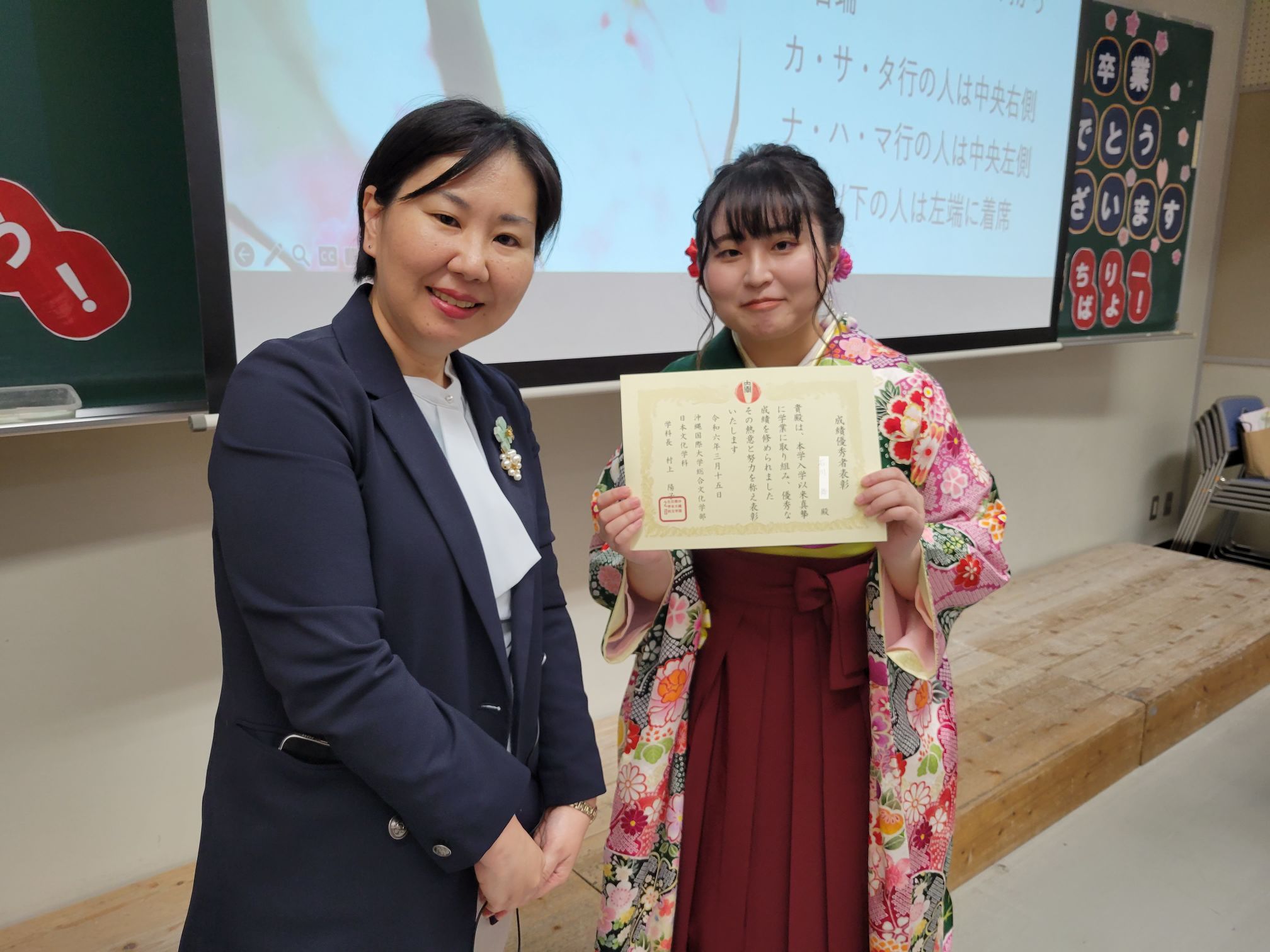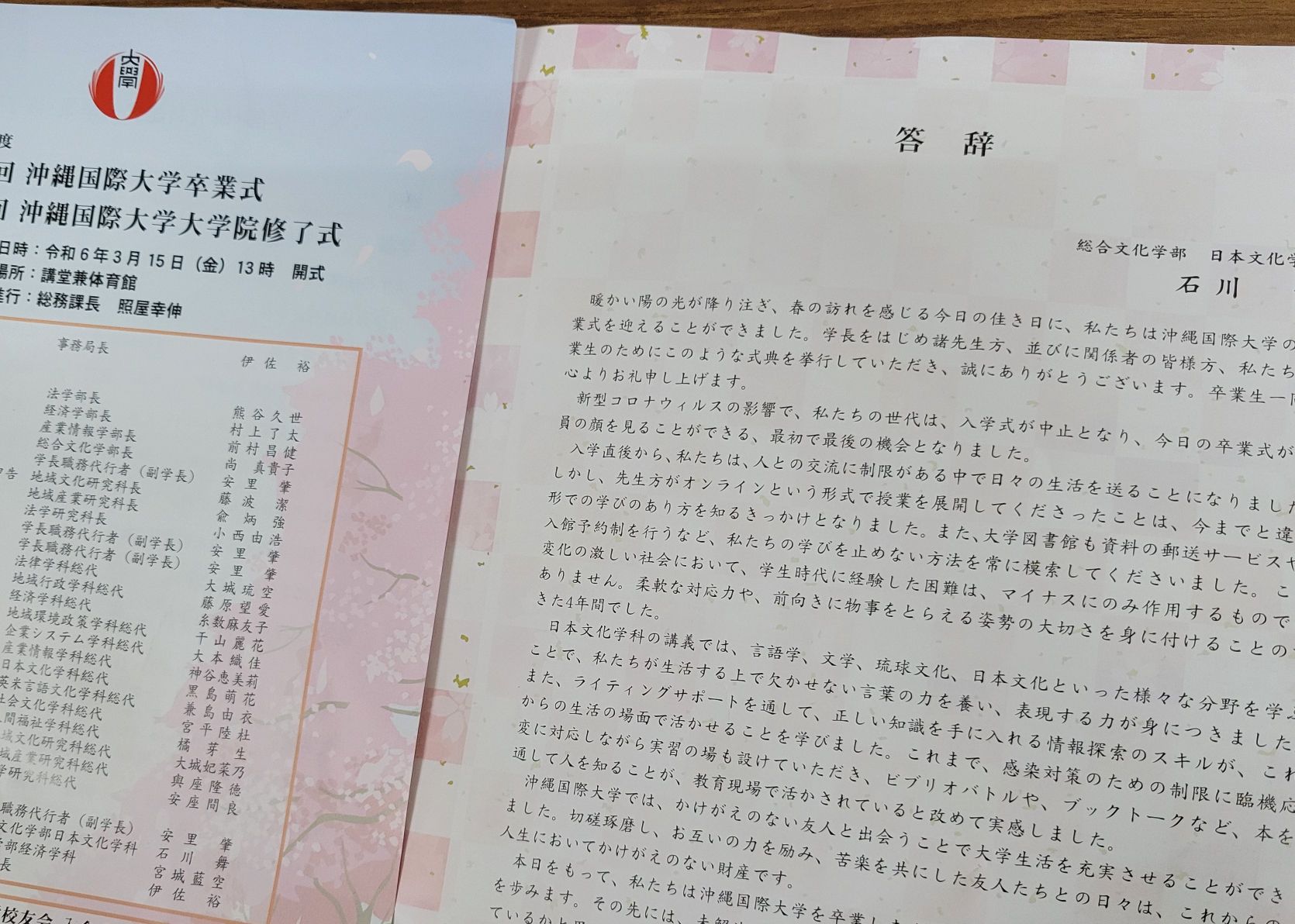 2024年3月15日に開催された沖縄国際大学卒業式、今年度の卒業生答辞は日本文化学科4年生の石川さんが担当しました。