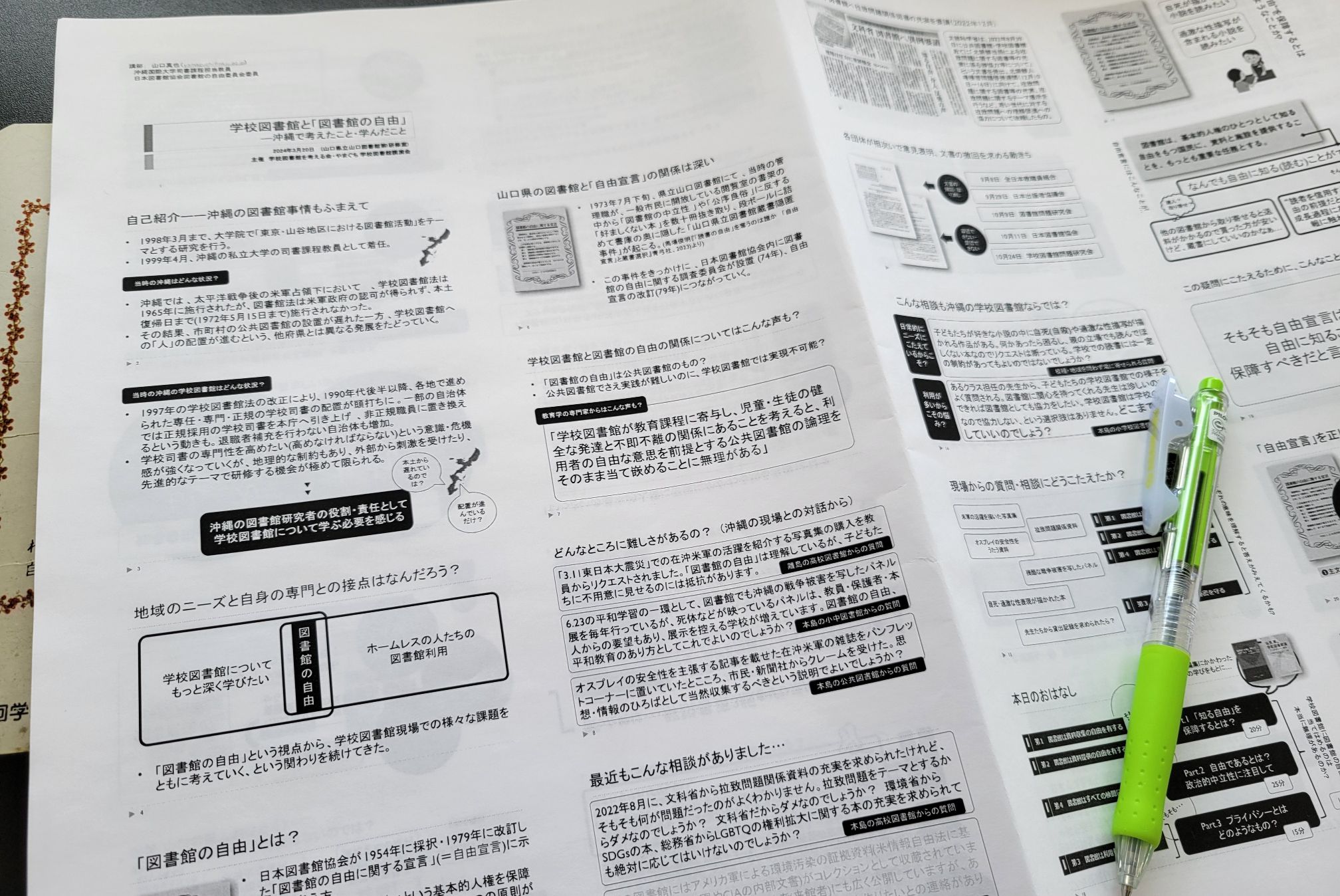 いつものような図書館現場で働いておられる司書の方を対象とした研修会とは異なり、今回は学校図書館に関心を寄せておられる市民の方を中心とする会の講演会ということで、「学校図書館と「図書館の自由」―沖縄で考えたこと・学んだこと」と題して、1999年に沖縄国際大学に着任してから25年間を振り返りながら、現場の学校司書の方々から寄せられた質問や相談を紹介しつつ、現場の方々と「図書館の自由」という視点でどのように学びを深めていったか、というお話をさせていただきました。