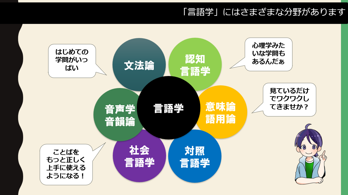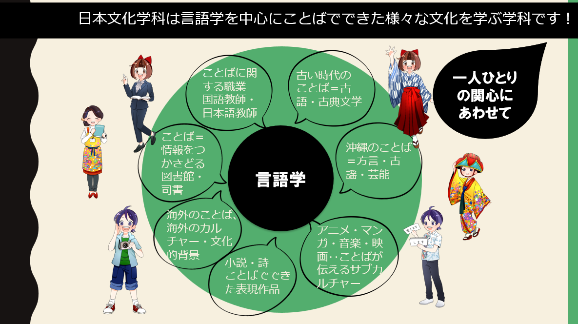 新しい学科紹介動画は、日本文化学科のカリキュラムムの中心にある「言語学」の面白さを伝えつつ、その学びが将来にどのように役立つのか、という2つのテーマで構成されています。(少しご紹介します!)