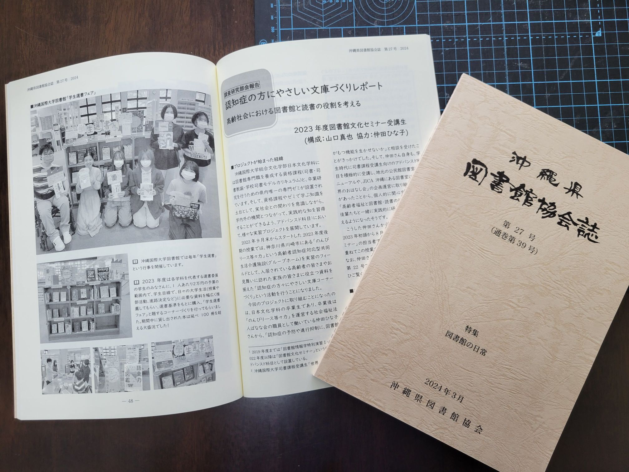 『沖縄県図書館協会誌』第26号にはその他にも、沖縄国際大学図書館にて司書課程の日文生が取り組んだ、学生選書フェアの楽し気な様子も写真スナップのコーナーで紹介していただいています。