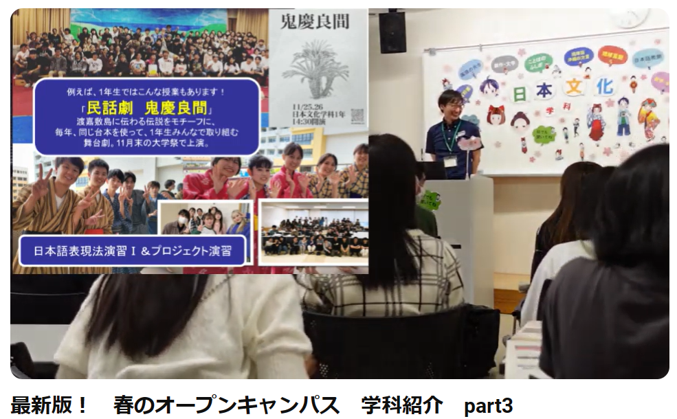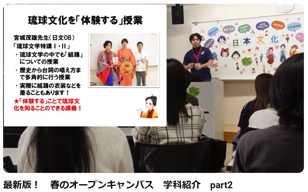 3月17日に開催された春のオープンキャンパス。会場に入りきらないくらいたくさんの学生さんに参加してもらいましたが、来場できなかった方向けに、当日の学科紹介の動画を、YOUTUBEの「おきこくにちぶんチャンネル」にて絶賛公開中です。