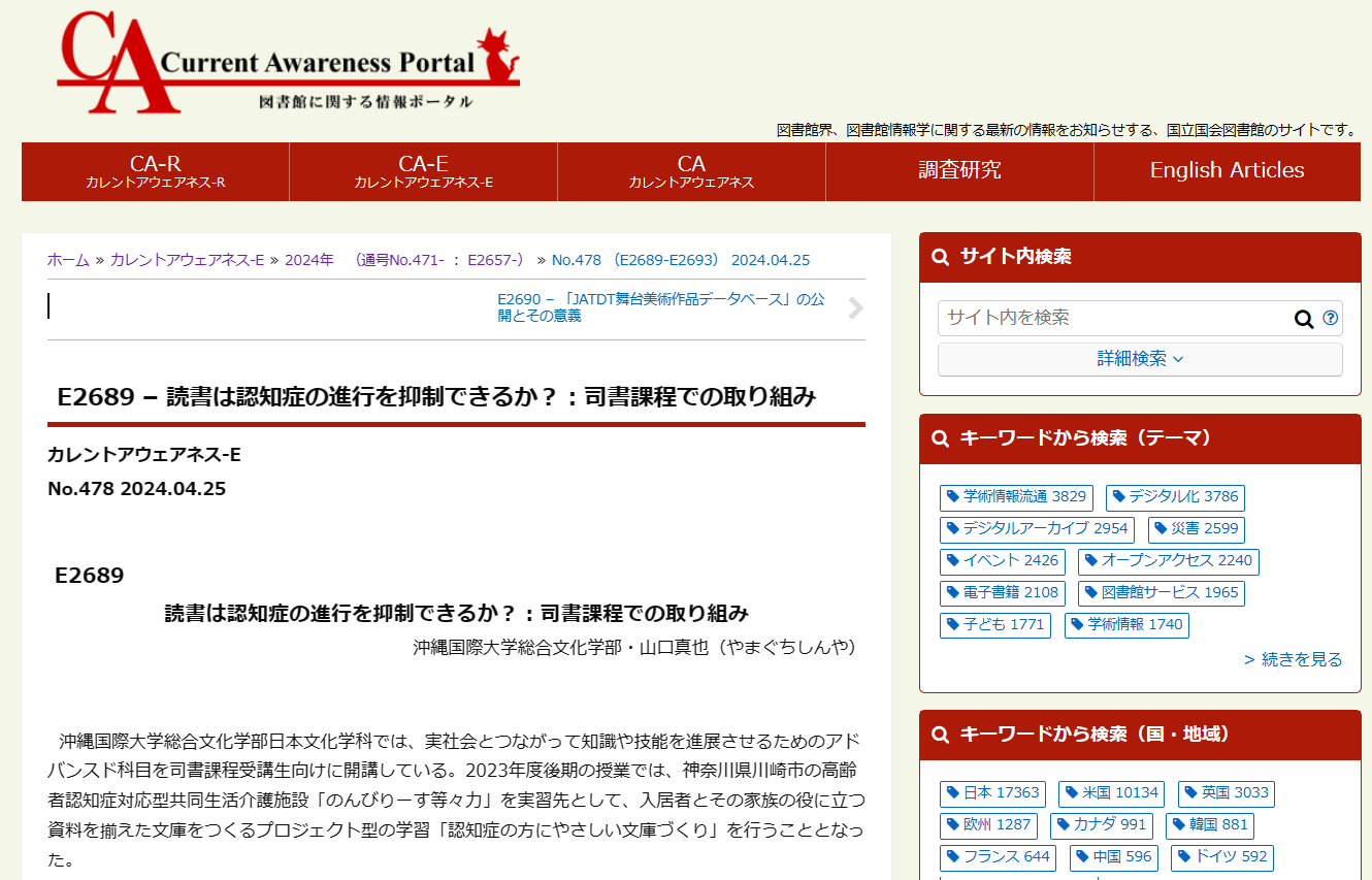 日本文化学科の学生たちを中心とするアドバンスド科目「図書館文化セミナー」での取り組みをまとめたレポートが、2024年4月25日に配信された「カレントアウェアネス-E」に掲載されました。