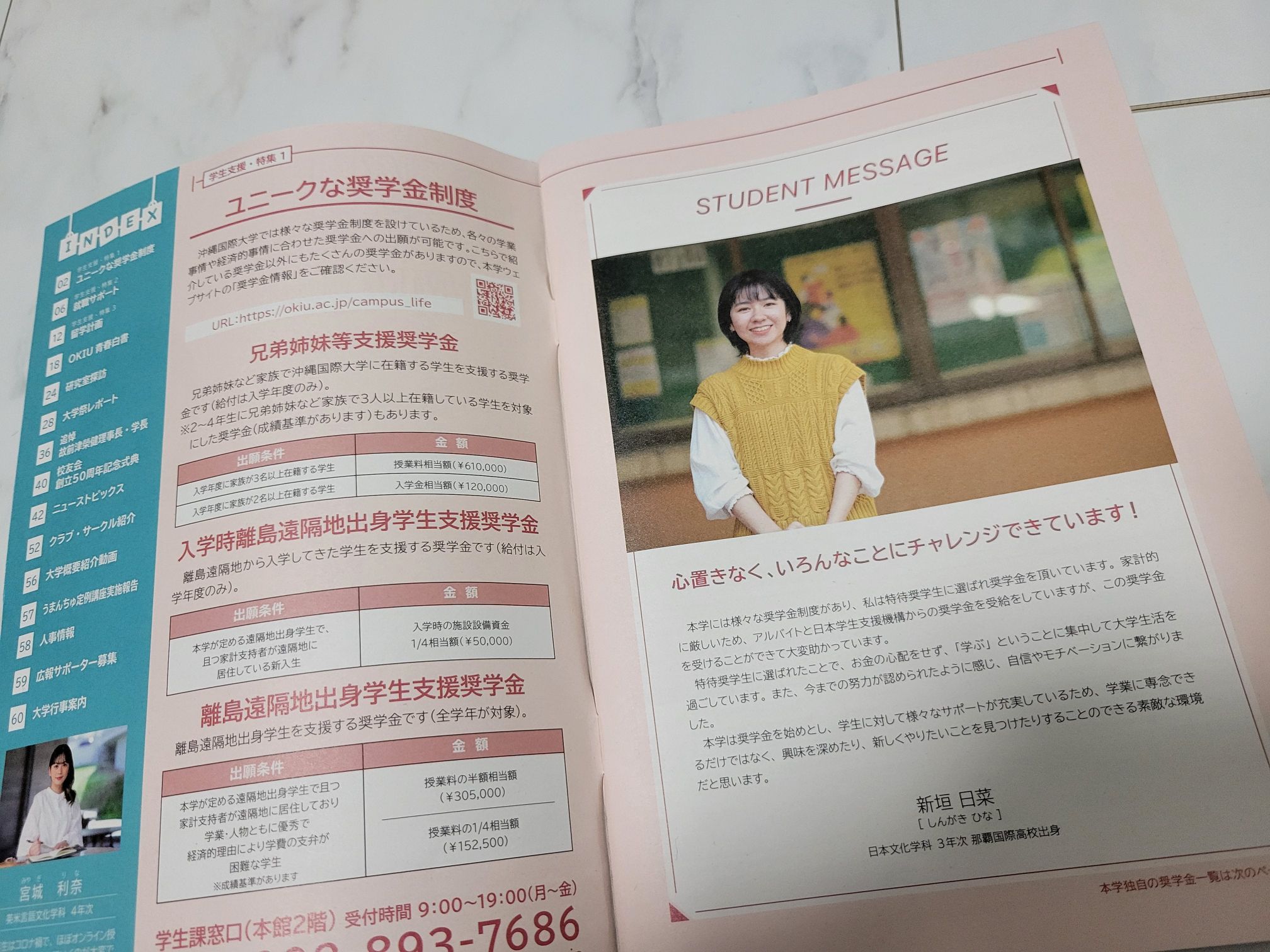 沖縄国際大学が毎年2冊発行している学報『OKIU MAGAZINE』。最新号にあたるVol.120-121では、沖縄国際大学独自の奨学金である「特待奨学生」という制度を紹介するレポーターとして、日本文化学科3年生(取材当時)の新垣さんが登場しています。
