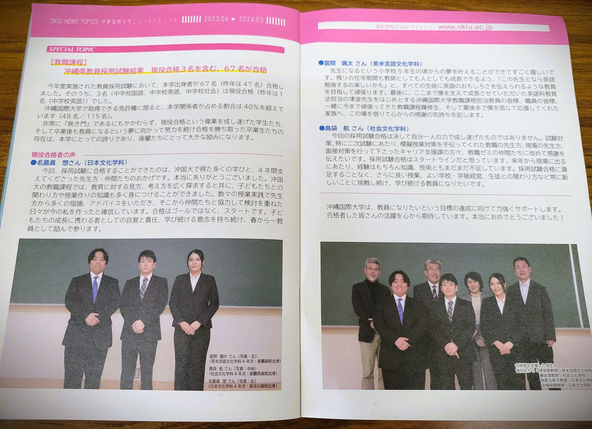 【学報『OKIU MAGAZINE』の最新号に教員採用試験に現役合格した4年生が登場!】